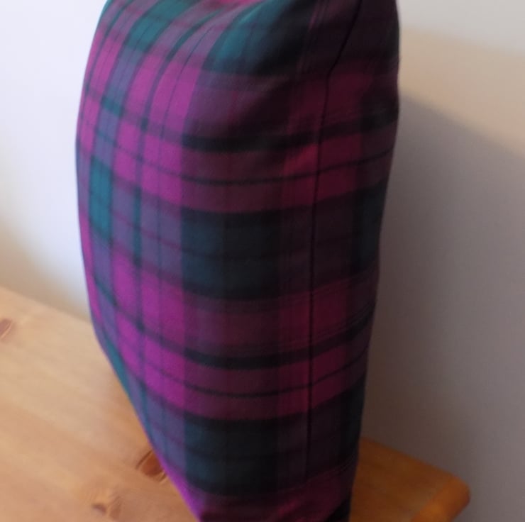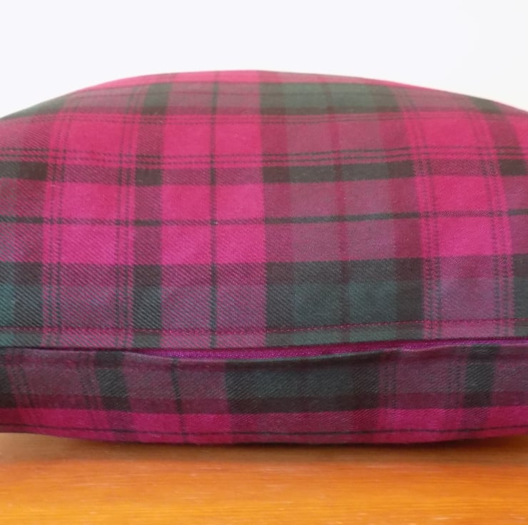 This cushion cover is made from a beautifully soft polyviscose fabric, and features a wine, dark pink and dark green plaid pattern.