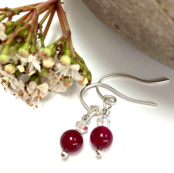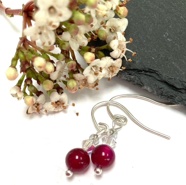 These pretty earrings are made from sterling silver with fuchsia pink agate gemstones and Swarovski crystals. They have handcrafted sterling silver fittings. The perfect gift for any occasion.