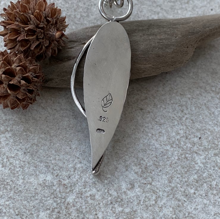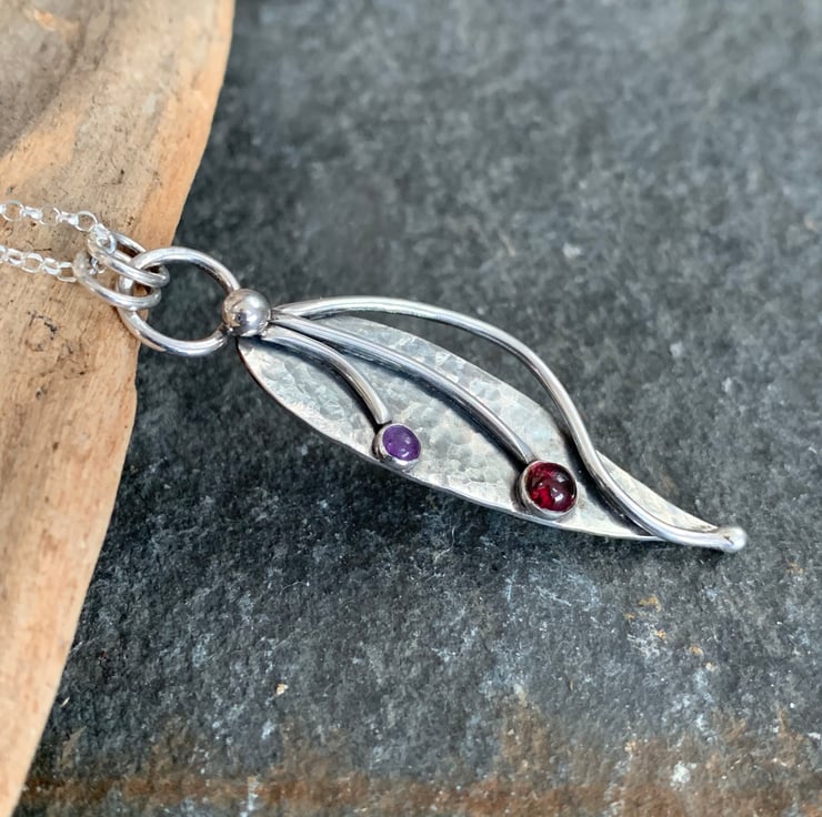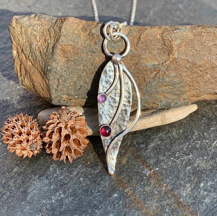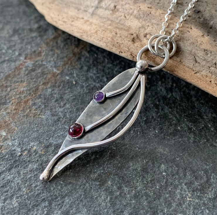 I created this stylised leaf design pendant from sterling silver 925. I added some hammered texture and have oxidised the silver to give an aged/antique effect. I then polished the raised areas to a bright shine to give contrast to the design. To enhance the design further I added a lovely deep red wine coloured garnet and a pretty purple amethyst.
