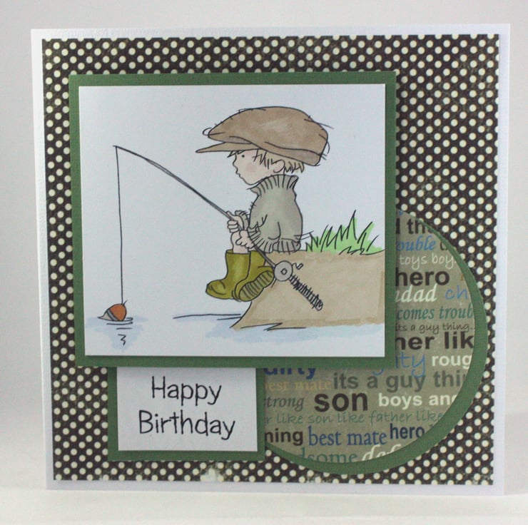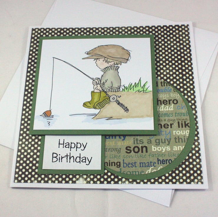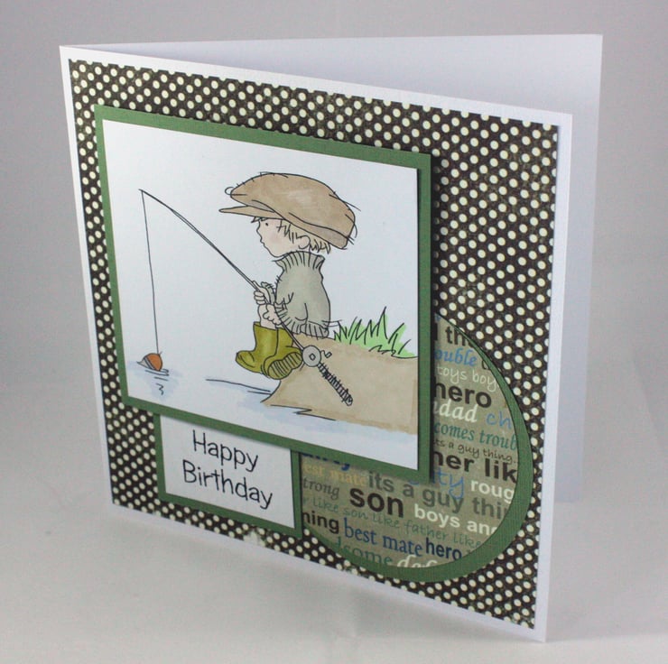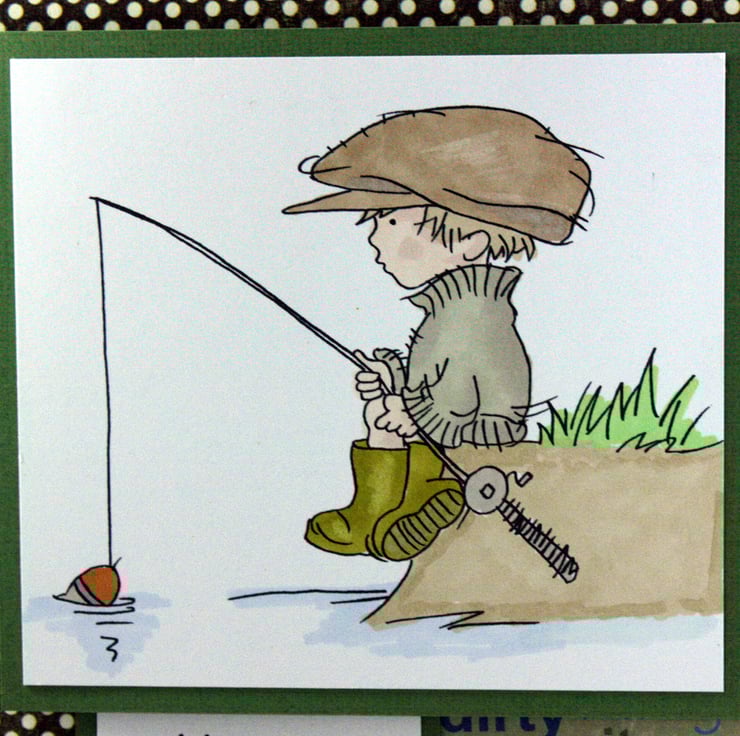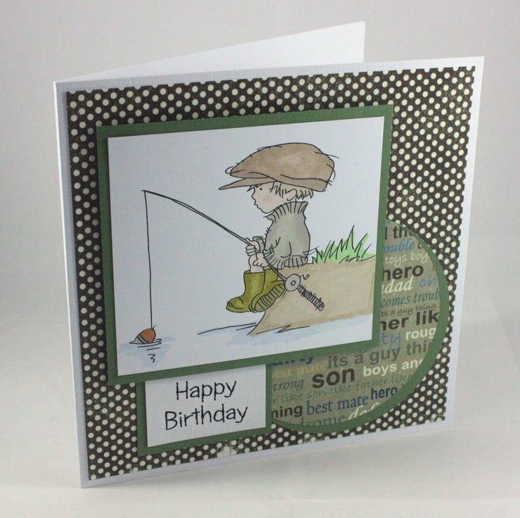 Square birthday card featuring a hand coloured image of a boy fishing on a river bank.