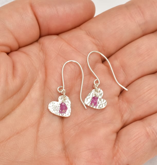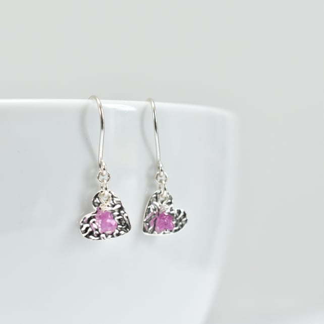 Gorgeous Pink Sapphires sit on top of textured fine silver hearts in these lovely earrings. The colour of the sapphires is an strong hot pink. I like to texture my silver components because the little dips and rises catch the light so beautifully, making them both flattering and pretty, while not being bling-y.