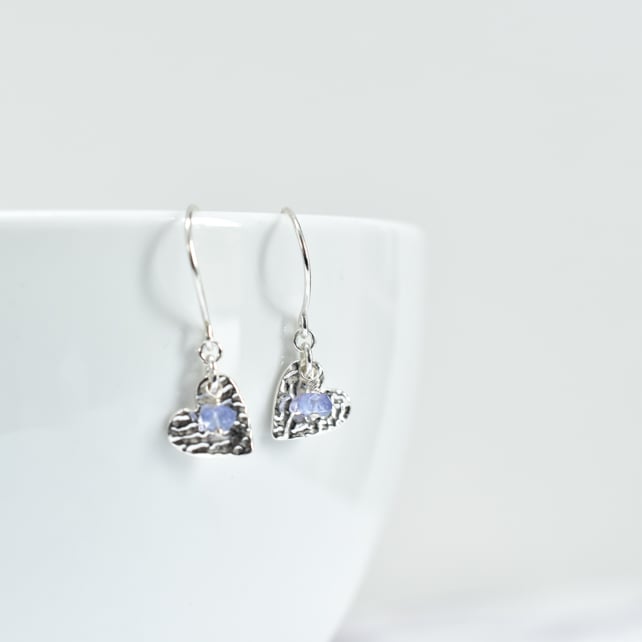 Gorgeous Tanzanites sit on top of textured fine silver hearts in these lovely earrings. The colour of the sapphires is a fabulous lavender blue. I like to texture my silver components because the little dips and rises catch the light so beautifully, making them both flattering and pretty, while not being bling-y.