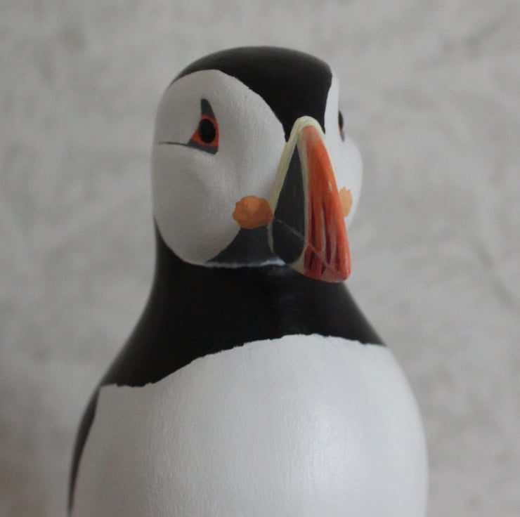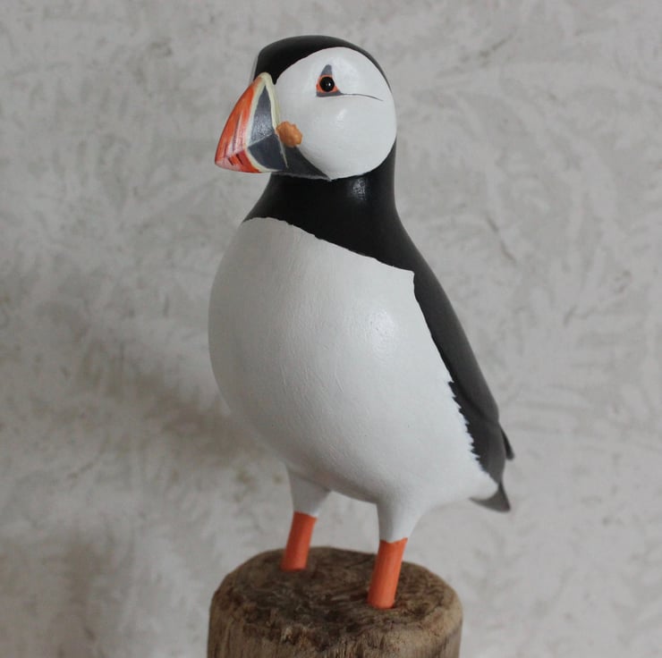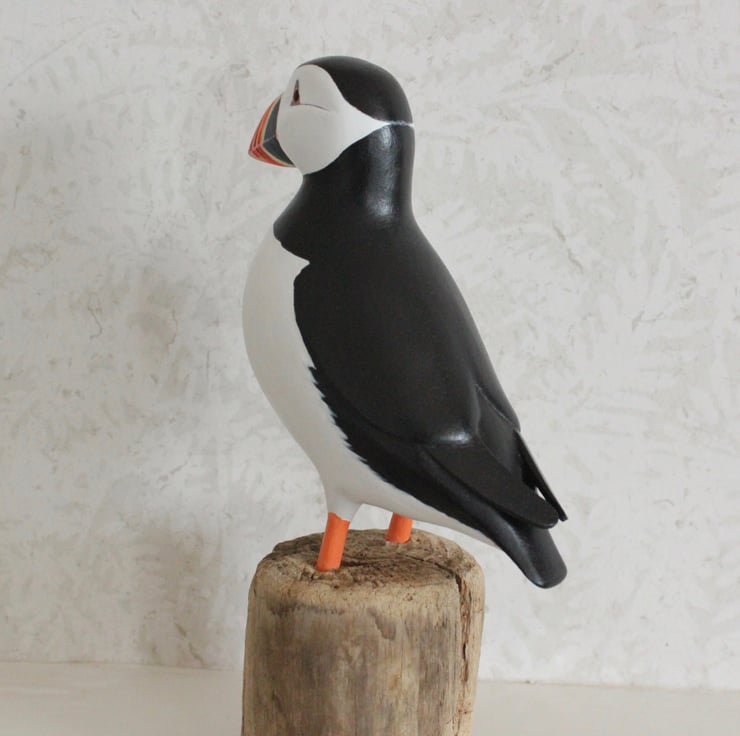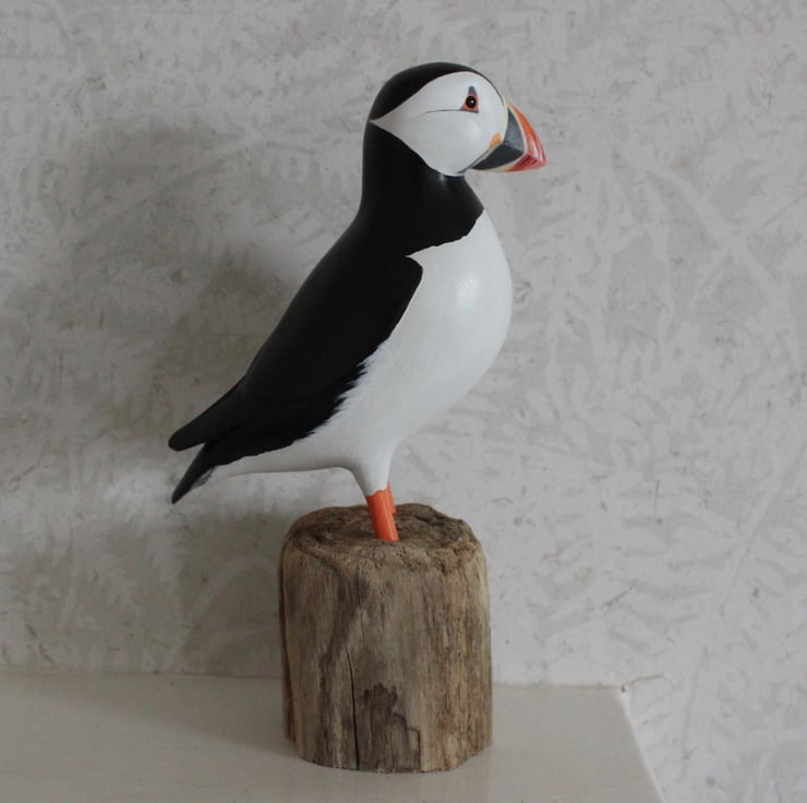 This half size puffin has been hand carved from wood. It has hand tinted glass eyes and raised wing detail. It has been painted with artists acrylics and then finished to a soft shine with wax. I have mounted it on a piece driftwood found on a local beach. The piece is 19cm tall overall, 6cm deep and 10cm wide. Apart from the initial blank, all the carving is done with a small hand knife using a selection of photos as a guide. SN397