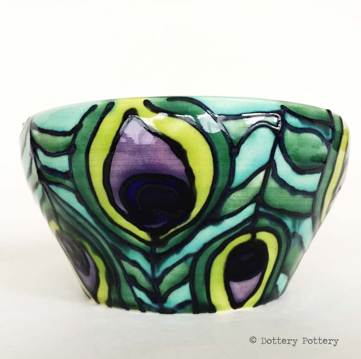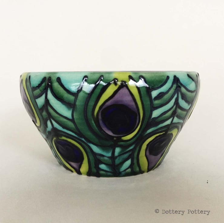 This hand thrown pottery bowl is made from earthenware clay.It has been thrown on the pottery wheel and decorated using various food safe glazes. A black outline of peacock feathers was applied first and then this was carefully filled in with glaze. 6cm high x 11cm wide