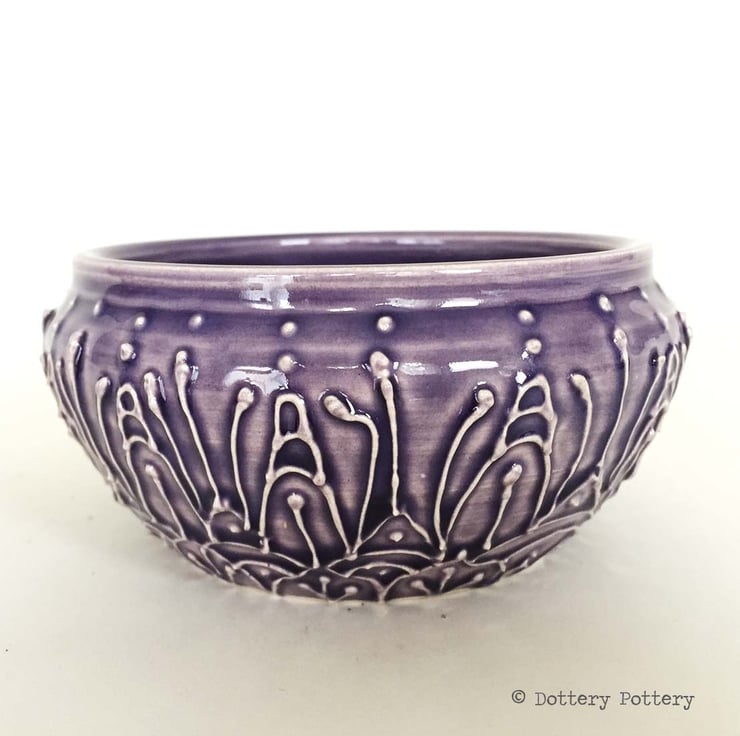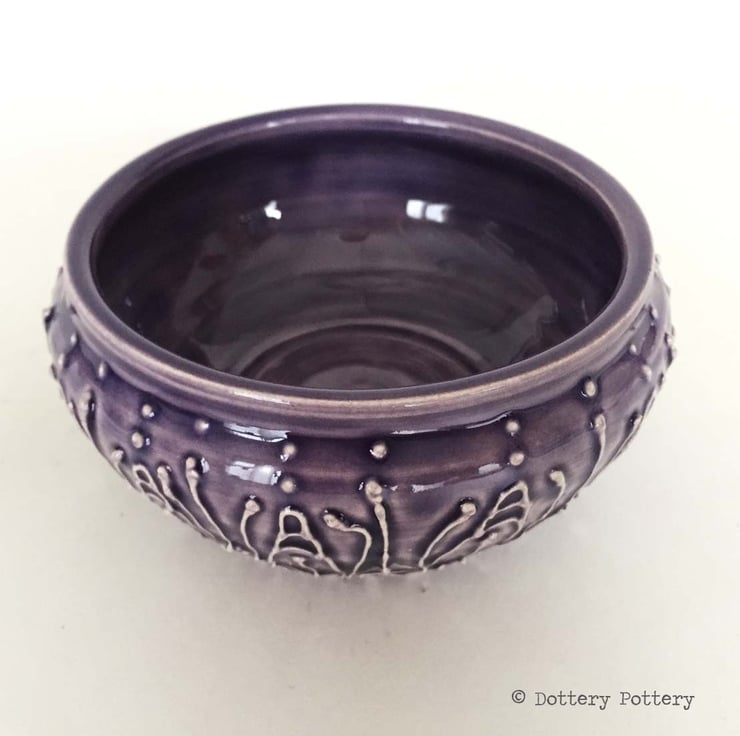 This hand thrown pottery bowl is made from earthenware clay.It has been thrown on the pottery wheel and decorated with a raised pattern. It has been finished in a purple glaze. 6cm high x 12cm wide