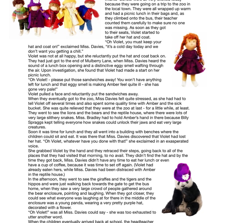 There are other children in Maisy’s class at Mulberry Green Infants’School - Violet, Billy, Amber, Rose, Ruby, Marigold, Tilly, Amelia and twins Oliver and Olivia. The children are all 28cm tall, Baby Daisy is 16cm and Molly the dog is just 8cm. Maisy and Mo love nothing more than having adventures with their friends.