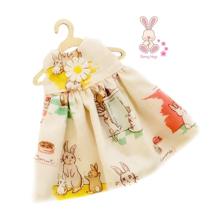 A vintage 1930’s style bunny print dress to fit the Mulberry Green characters. The dress is made from best quality cotton, has a lined bodice and is decorated on the bodice with a daisy. It comes with a cute little wooden hanger.