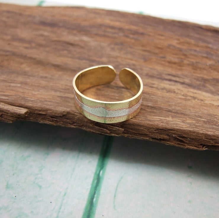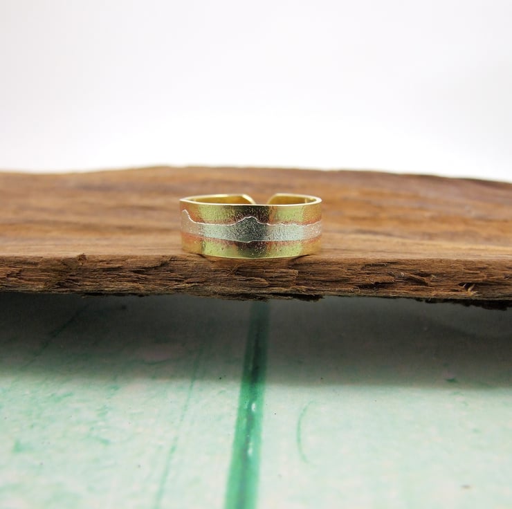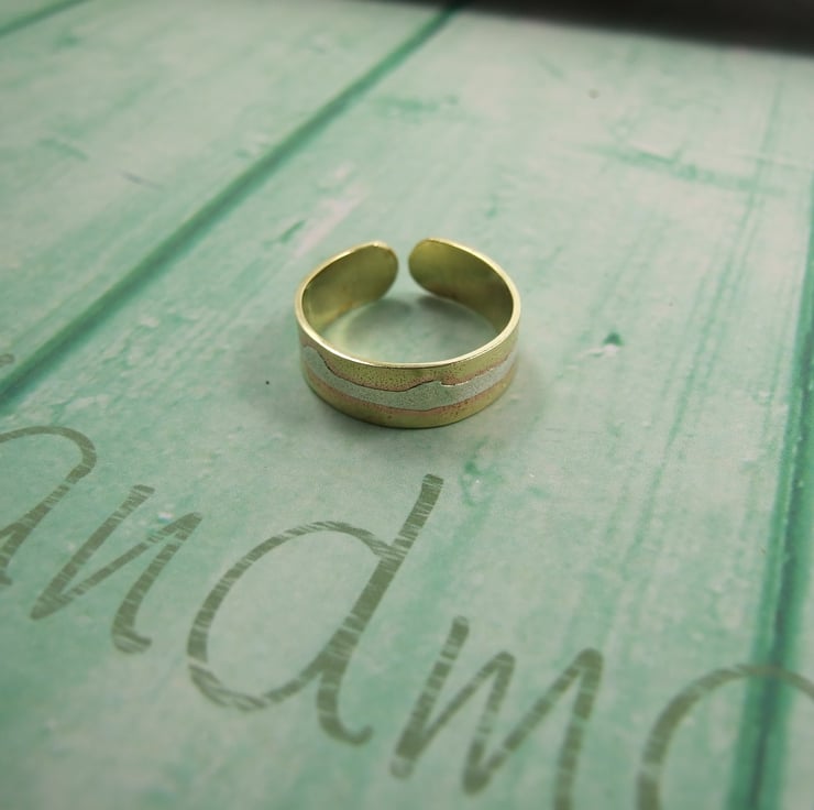 I have made the ring from solid 0.7 thick brass sheet which has been hammered and shaped and overlaid with sterling silver to resemble a view of the Welsh Mountains I see every day from my window which I have fused in place and given a frosted rustic finish. The ring is not solid round it is an open design can be adjusted to suit. Currently sized to UK M, but can be adjusted to fit larger finger, please note in comments during purchase if you would like the ring adjusted to suit.
