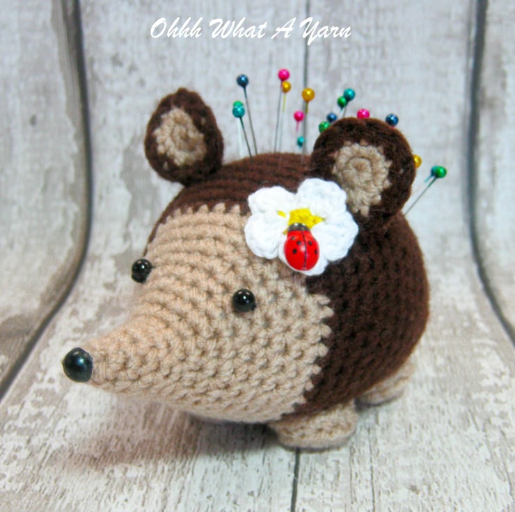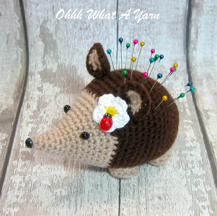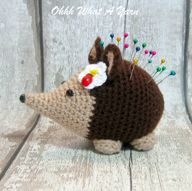 Crocheted, crochet, hedgehog, hoggy, pin cushion, pincushion, or ornament. The little hedgehog has a ladybug friend and a pretty daisy flower on her head.