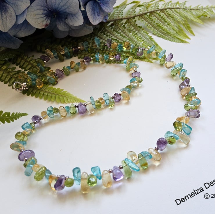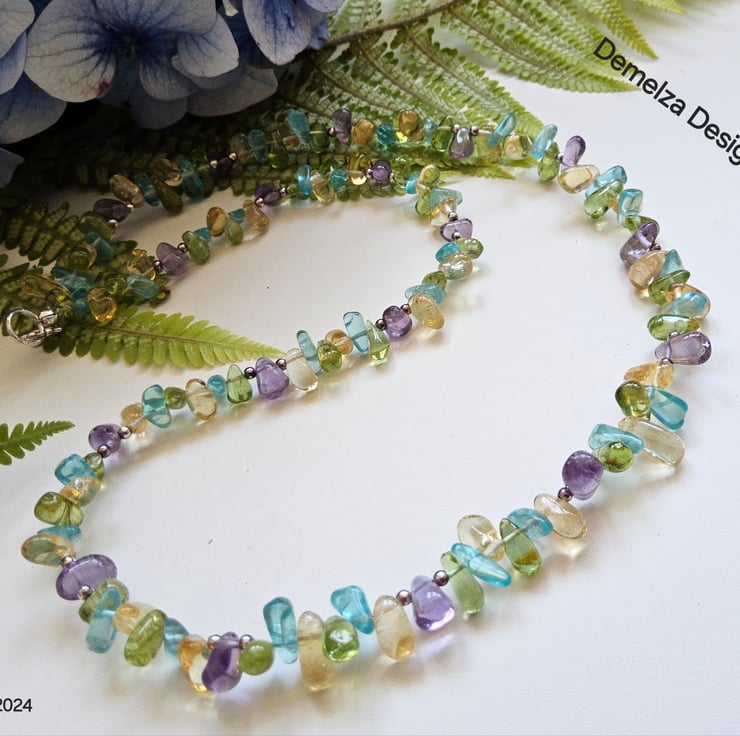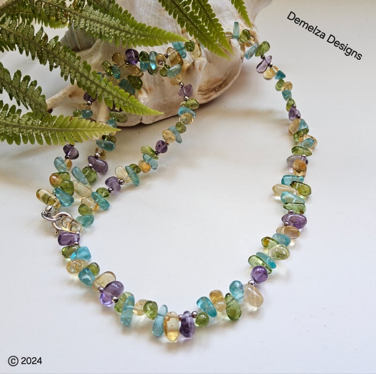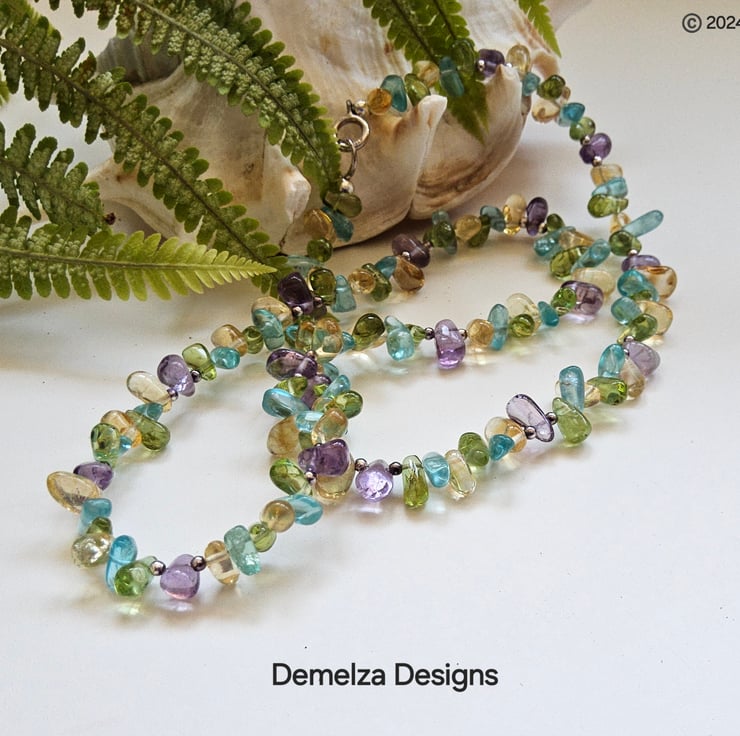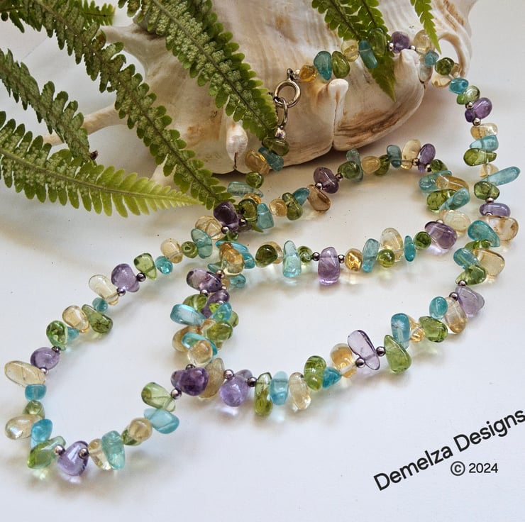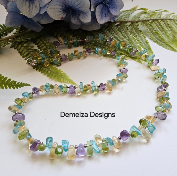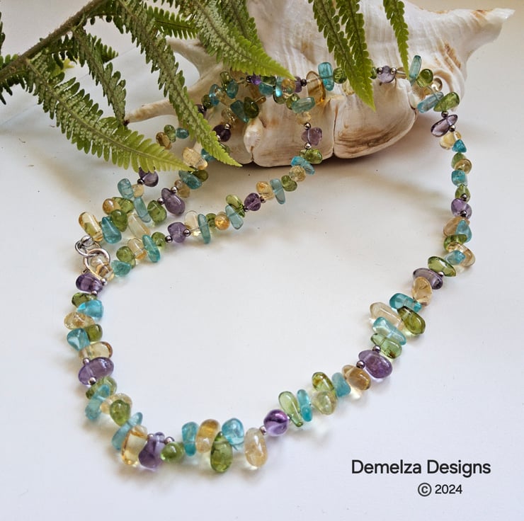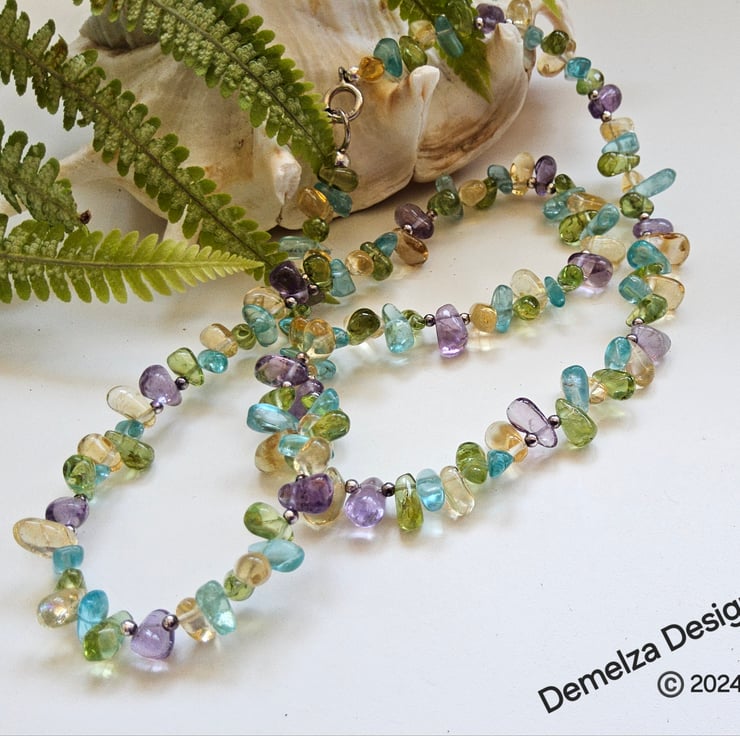 A very feminine eye catching necklace designed and hand crafted in Cornwall using irregular shaped A grade quality genuine gemstone drops. The drops have exceptional clarity and colour for their size. The gemstones consist off citrine, apatite, peridot and amethyst. Between each amethyst drop are 2mm 925 sterling silver spacer beads for added sparkle during wear and luxury. For the main construction coated professional stainless steel jewellers wire has been used for added strength and lasting durability, finished off with a 925 sterling silver bolt ring clasp, D ring and crimp covers.