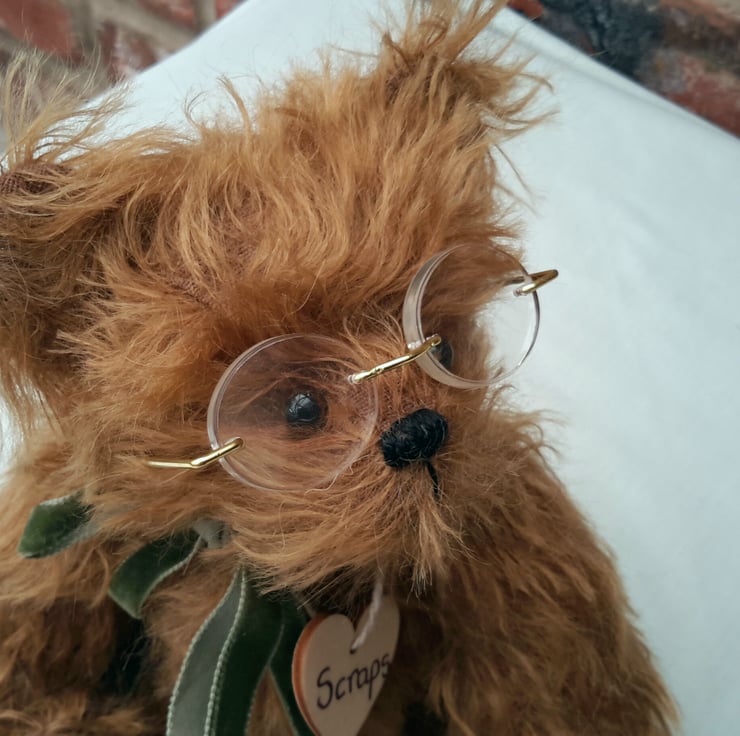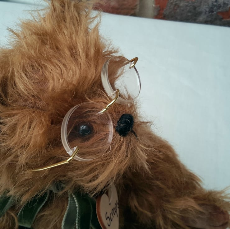 This is Scraps, he is a cute little artist bear at 9" tall and made from a gorgeous 20mm semi sparse mohair in Golden brown.