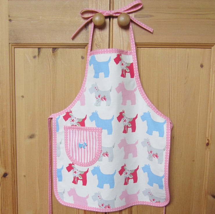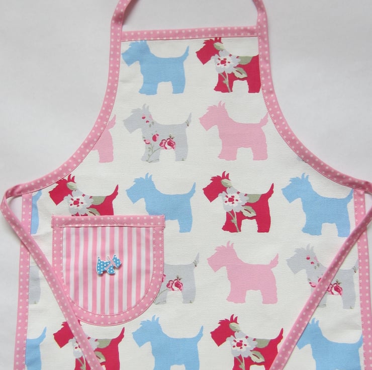 Cute apron in Scottie dog fabric with pink striped pocket and added Scottie dog button. Edged with pink and white spotty bias binding.