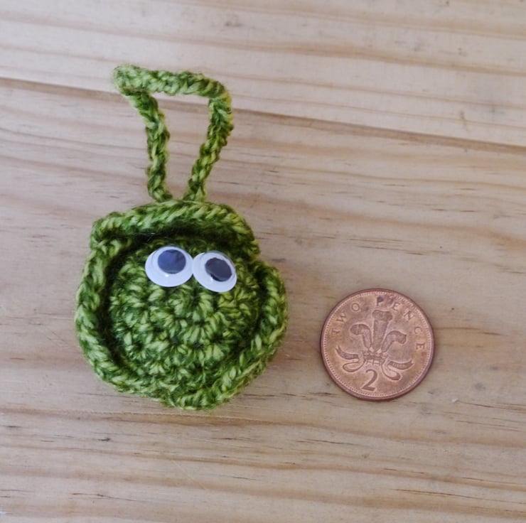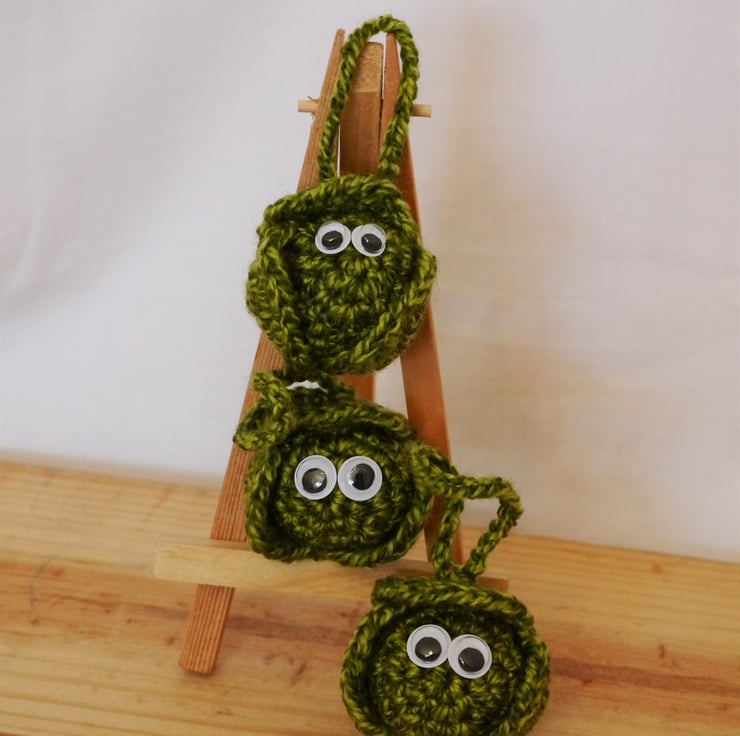 Sprouts love them or hate them everyone can enjoy these cute and quirky crochet decorations. In mixed greens with googly eyes giving them each their own personality. Each sprout is approximately 5cm across and 8cm tall including hanging loop and listing is for set of three. Hang them on the tree or anywhere during the festive period.Created in a pet and smoke free home. Designed as a decoration not a toy.