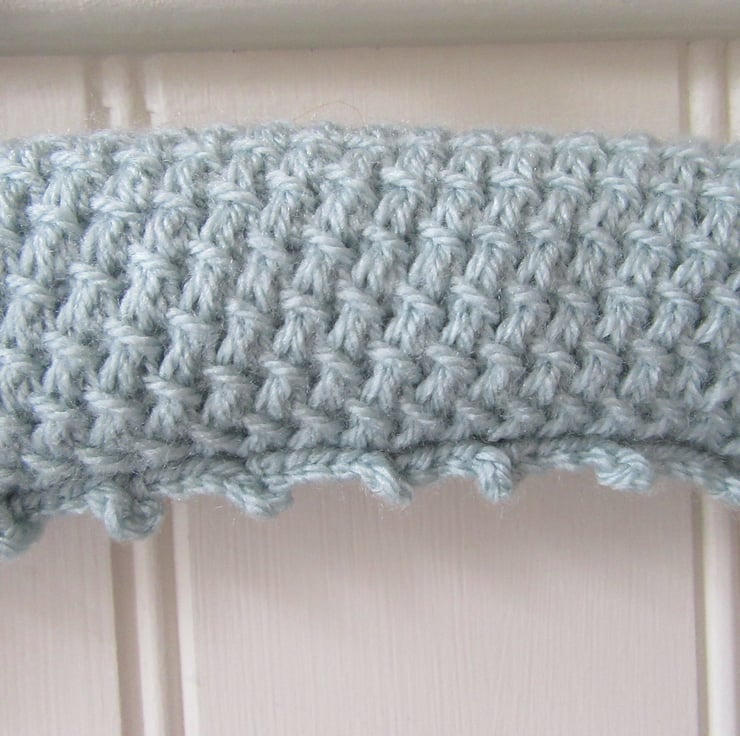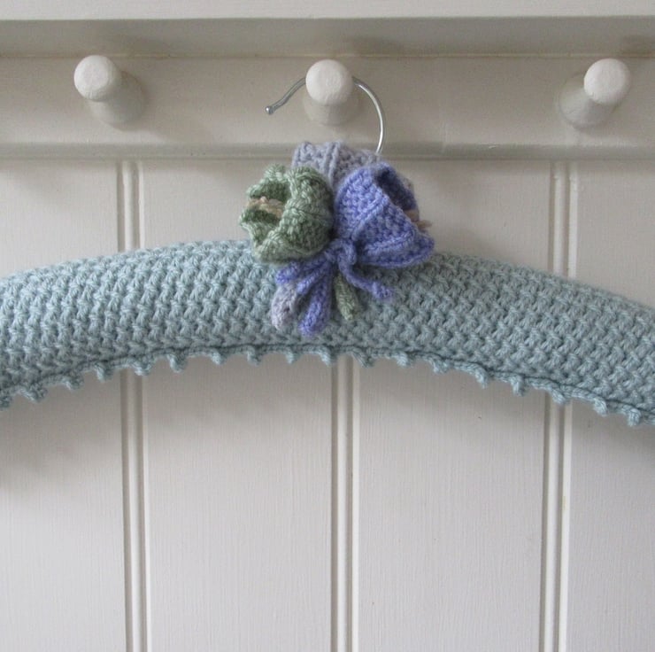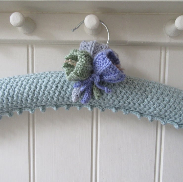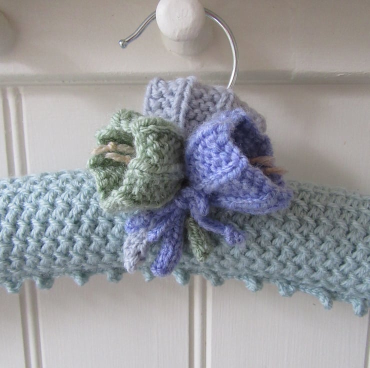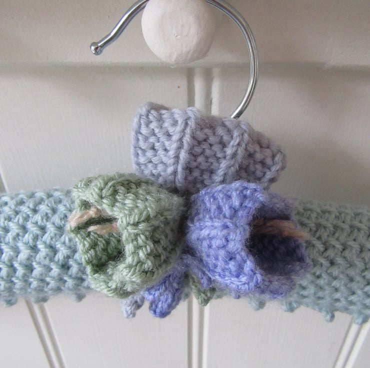 A beautiful hand knitted ladies padded coat hanger. The cover is knitted in duck egg blue coloured yarn using an all over textured stitch like basket work. The bottom hem is bound with a crocheted picot edging, using the same duck egg blue coloured yarn. There are three hand knitted crocus flowers nestled under the metal hook: 1) knitted in silver coloured yarn; 2) knitted in lavender coloured yarn; 3) knitted in a spring green coloured yarn. Each of the flowers has two honey coloured stamen. These flowers are secured to the hanger with a handmade cord in the same contrasting lavender coloured yarn. The wooden hanger is generously wrapped in wadding giving a soft body to the hanger.