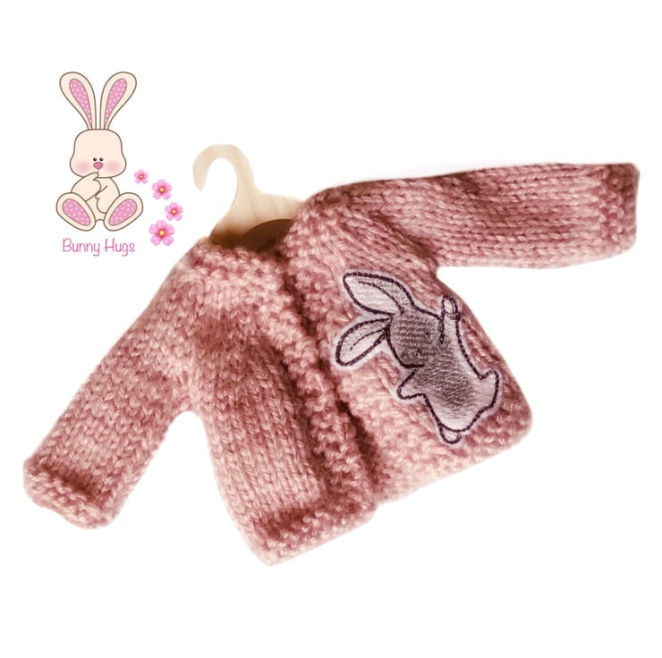 A really lovely bunny cardigan, hand knitted with lovely soft pink wool and embroidered with a baby bunny.
