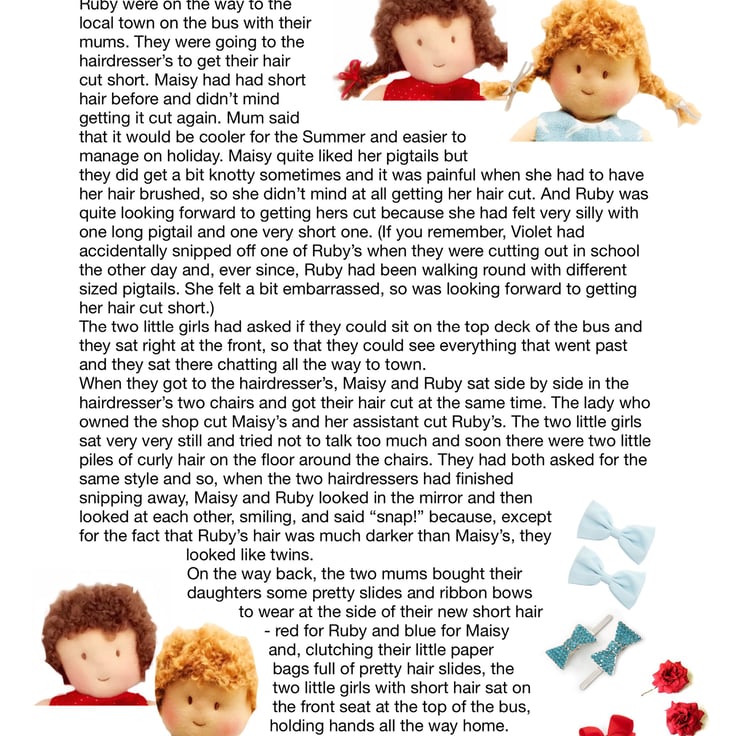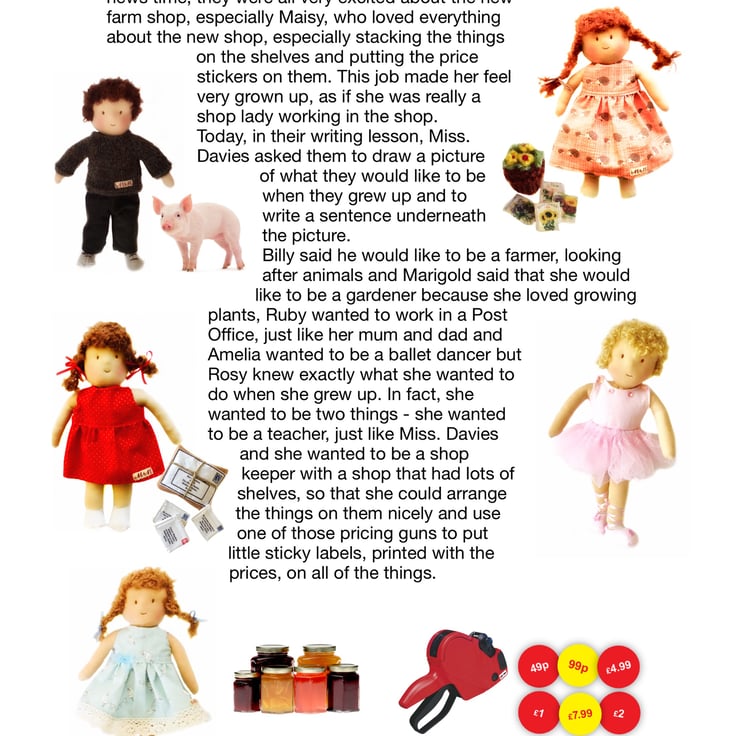 There are other children in Maisy’s class at Mulberry Green Infants’School - Violet, Billy, Amber, Rosie, Tilly, Amelia, Ruby, Marigold and twins Oliver and Olivia, who have a puppy called Oscar. The children are all 26cm tall, Baby Daisy is 16cm and the dogs are just 8cm. Maisy and Mo love nothing more than having adventures with their friends.