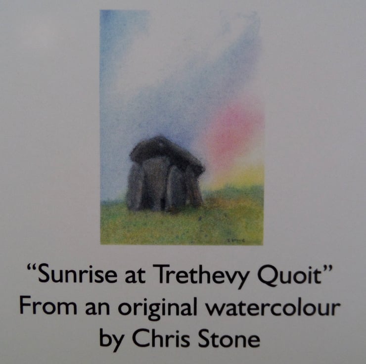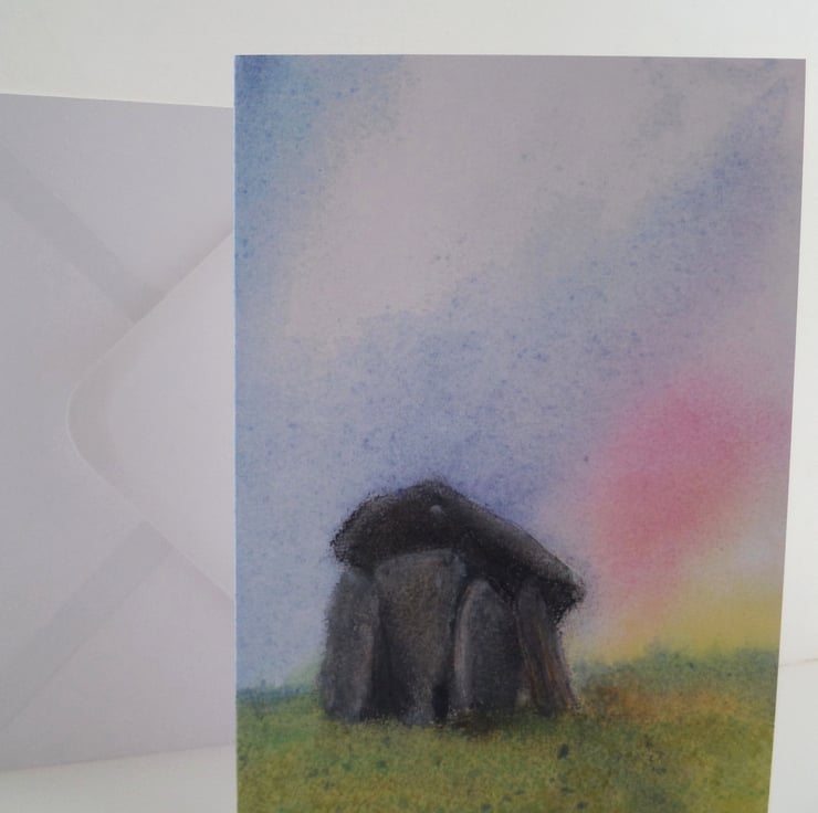 A professionally produced greetings card printed from from my original watercolour and oil pastel painting of Trethevy Quoit at sunrise.