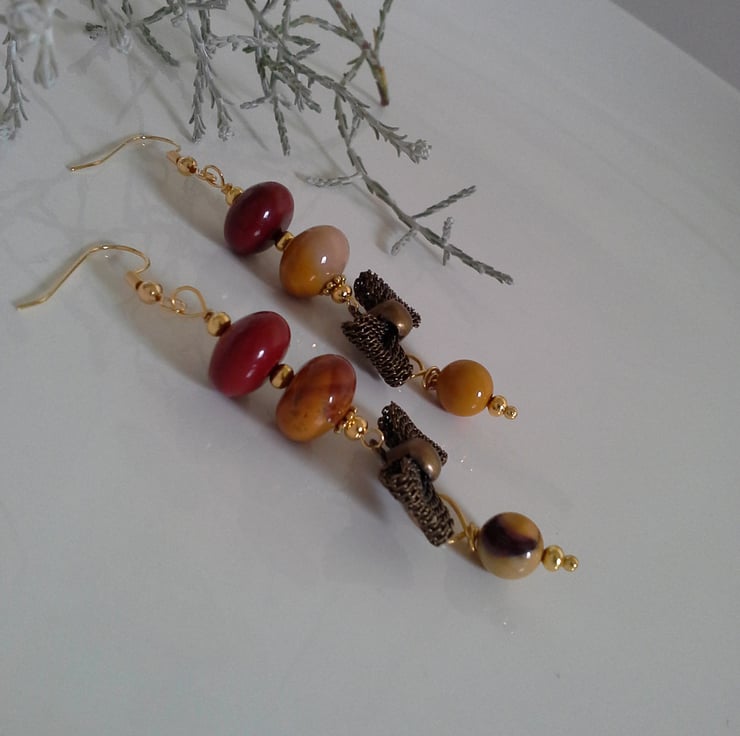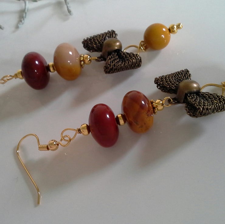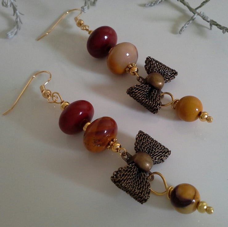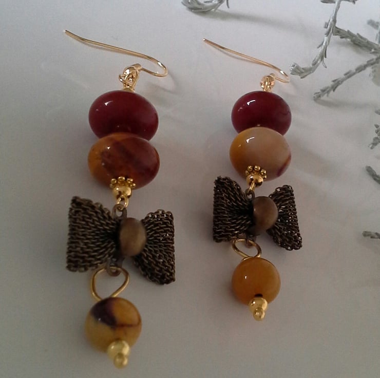 A unique pair of earrings designed and hand crafted using rare quality mookite gemstones, complimented with a metal mesh bow with quality gold plated findings. These would make a perfect quality unique gift for a dear friend, family members, mother's or just as a guilt free treat to yourself without breaking the bank. The drop length from the bottom of the earing wire is 2.1/2" inches or 6.5cms.