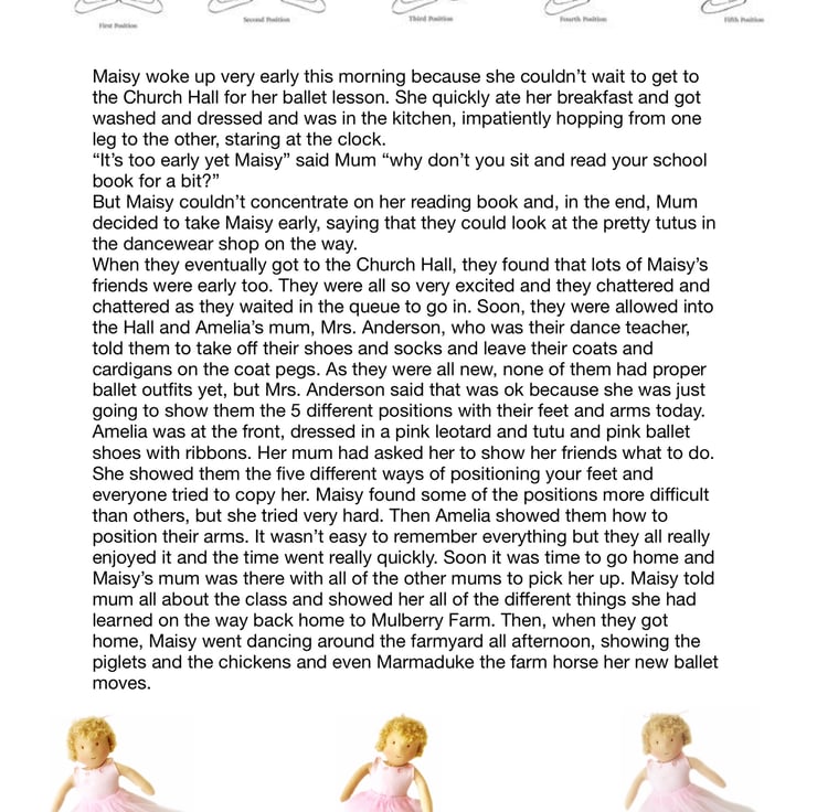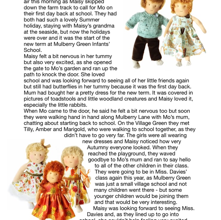 There are other children in Maisy’s class at Mulberry Green Infants’School - Violet, Billy, Amber, Rose, Ruby, Marigold, Tilly, Amelia and twins Oliver and Olivia. The children are all 28cm tall, Baby Daisy is 16cm and Molly the dog is just 8cm. Maisy and Mo love nothing more than having adventures with their friends.
