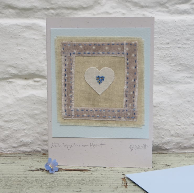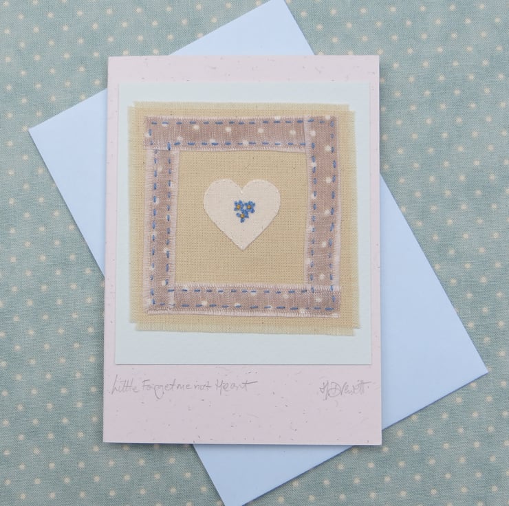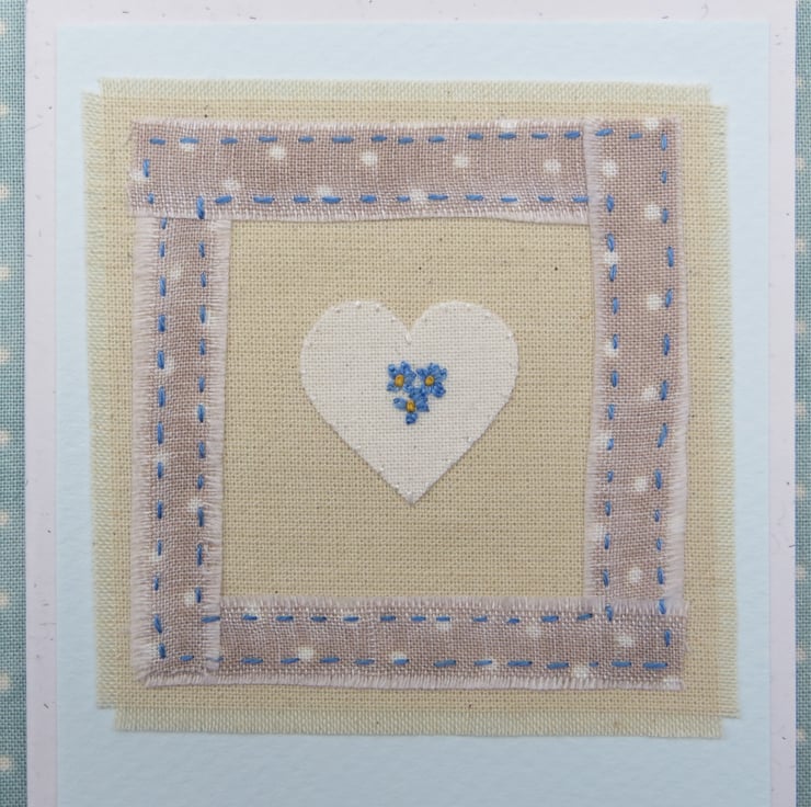 This little applique heart is stitched into place with tiny white silk stitches, and the border polka dot fabric pieces are also stitched into place by hand. I have embroidered three little forget-me-nots in the centre. Everything cut and stitched by hand, to make a card to keep.