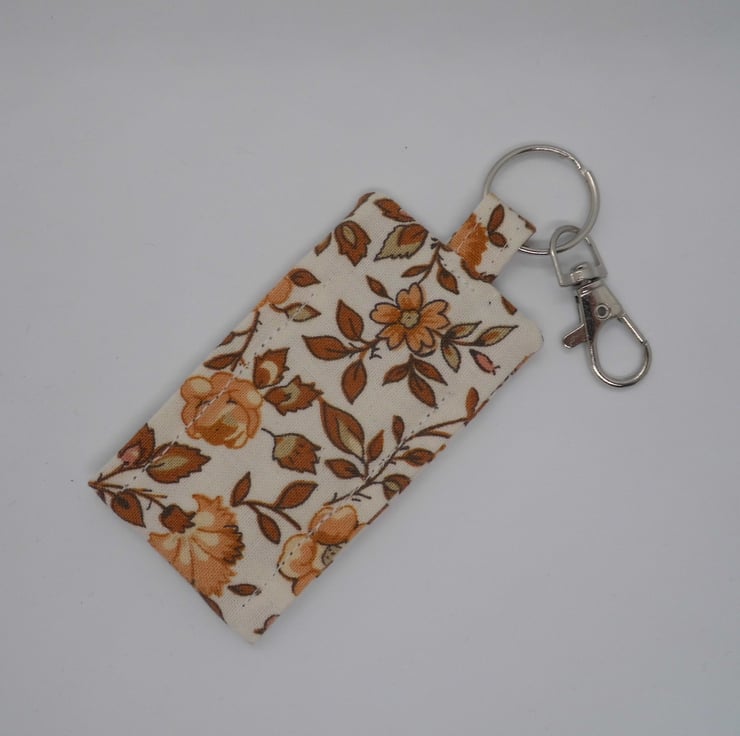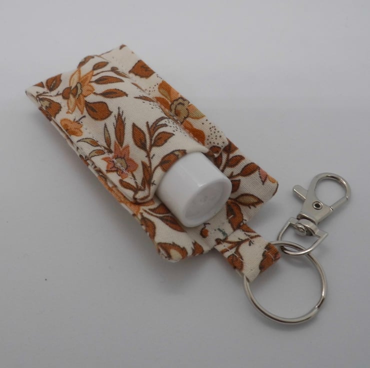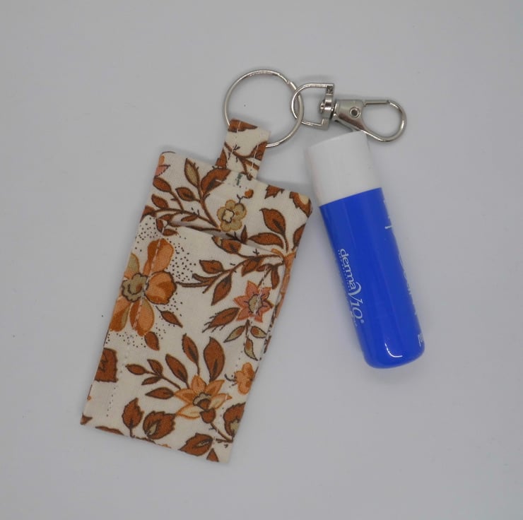 This is a little fabric pouch with a lobster clasp key ring attached, designed to keep your lip balm stick handily clipped to your bag, purse etc and is made using a cotton Sanderson print in Autumnal colours.