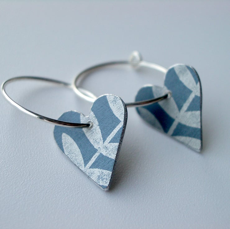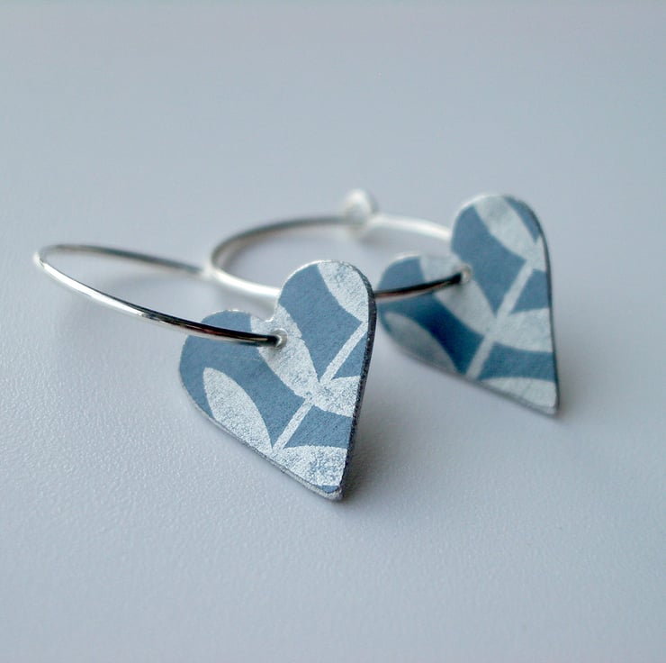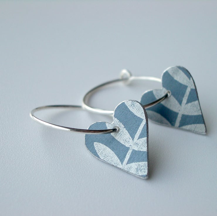 These cute little heart earrings are made from aluminium which I have dyed grey and printed with a silver leaf design. The dye is made permanent through heat and the colour becomes part of the metal. I cut out the heart shapes by hand using a jewellers saw and file the edges to give a nice finish. Finally I have hung them on 15mm sterling silver hoops. The hearts measure approximately 12mm x 12mm.