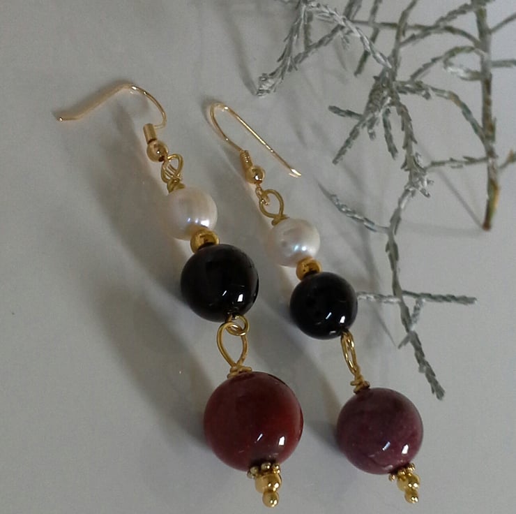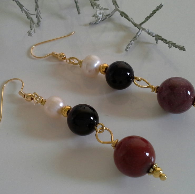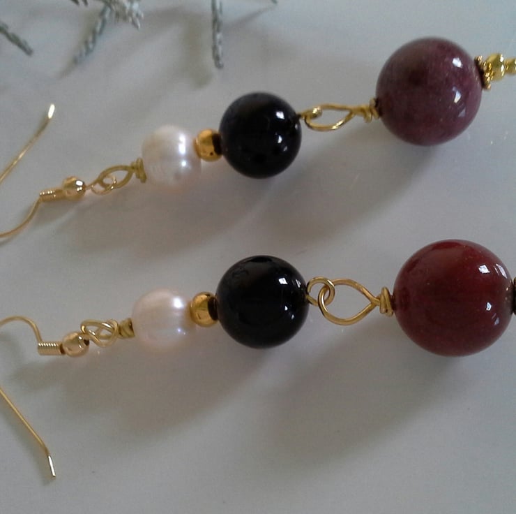A lovely luxury looking pair of earrings designed and hand crafted by myself using white freshwater pearls, black agate and mookite gemstones. They have been constructed using quality gold platedcomponents.