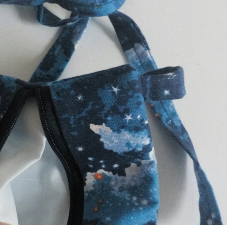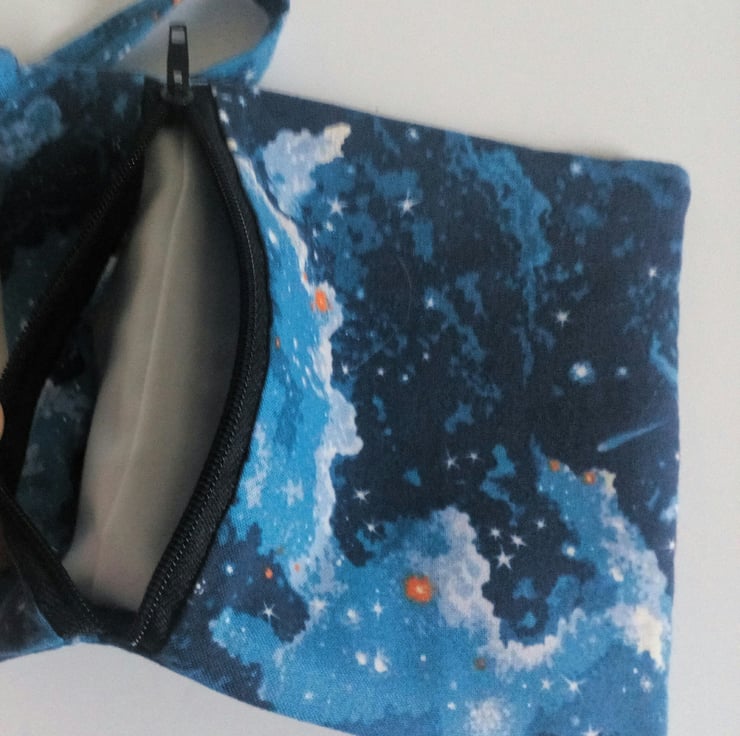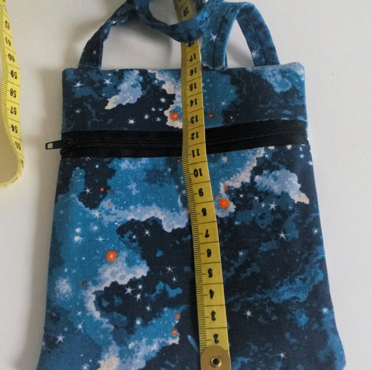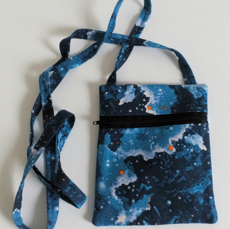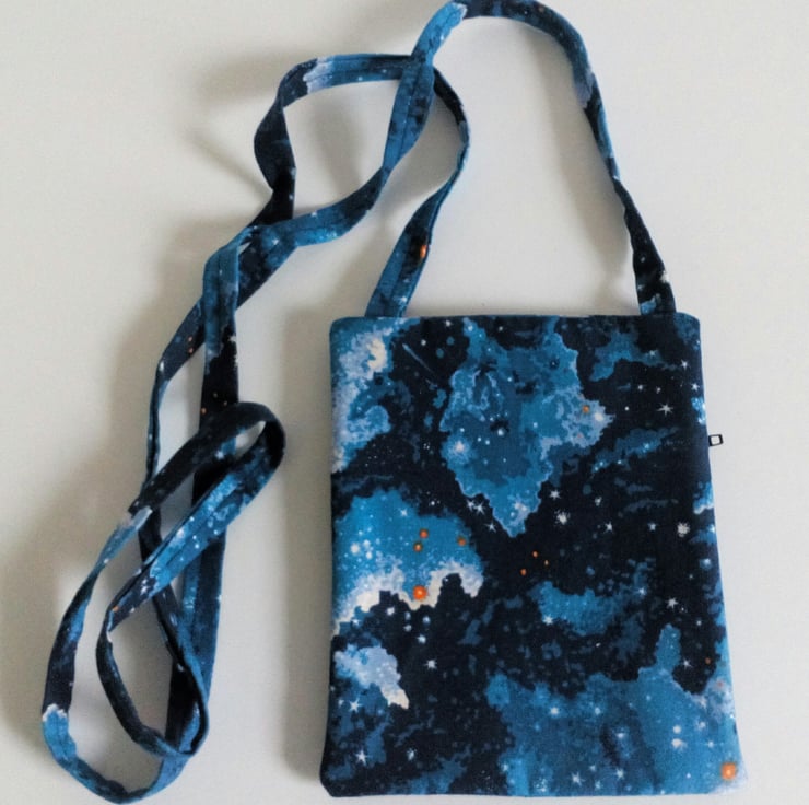 Crossbody bag with a stars and Universe design on cotton fabric. It has an inside pocket and zipped front.