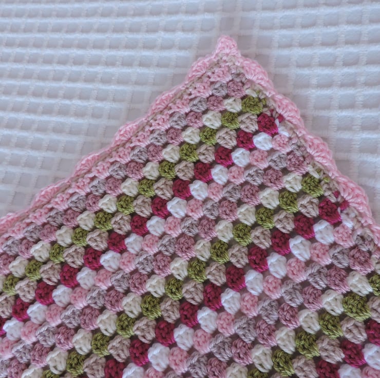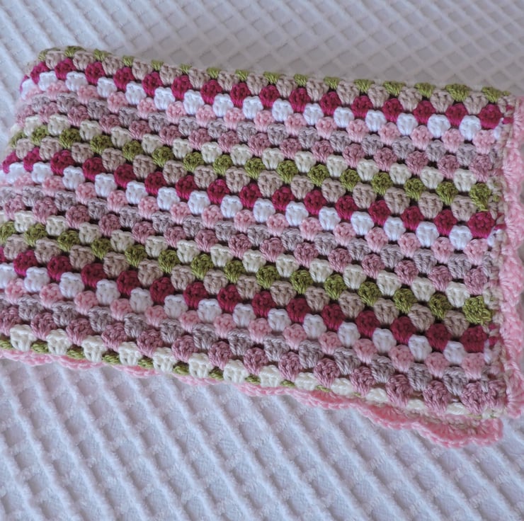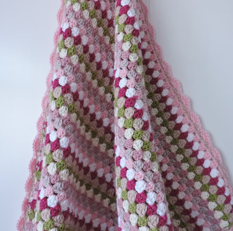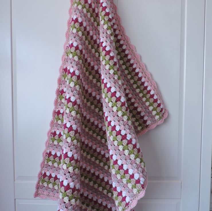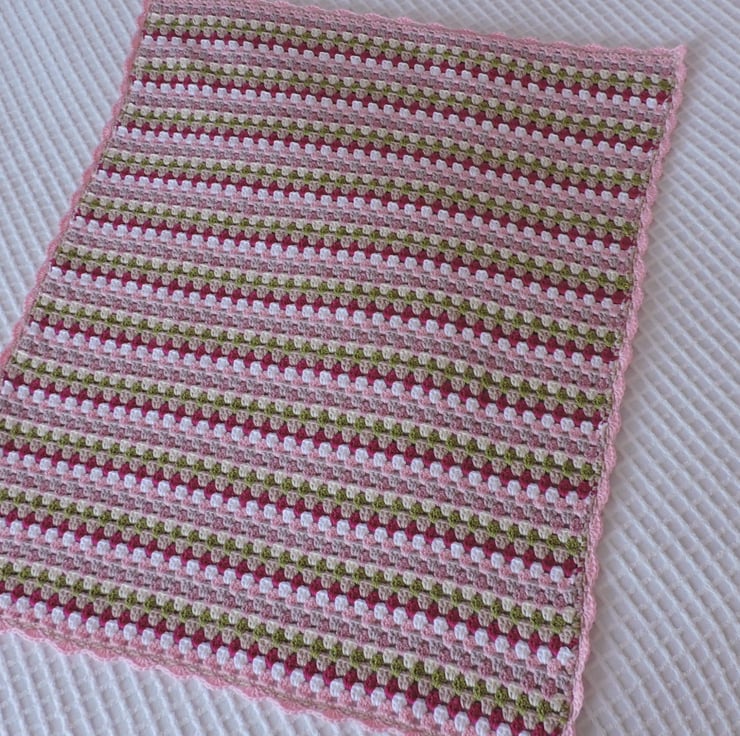 SALE was £17 now £12.50 A pretty pastel striped blanket which I've crochet in soft acrylic double knit yarns. Pinks, green, cream and white.