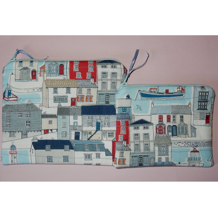 This listing is for a set of two zip purses, perhaps one for coins or cards, and the other for make up etc. the choice is yours. They are made from fabric featuring harbour scenes, boats, and lighthouse, which has been quilted to enhance the effect. They are lined in toning fabric, and are fastened with a zip.