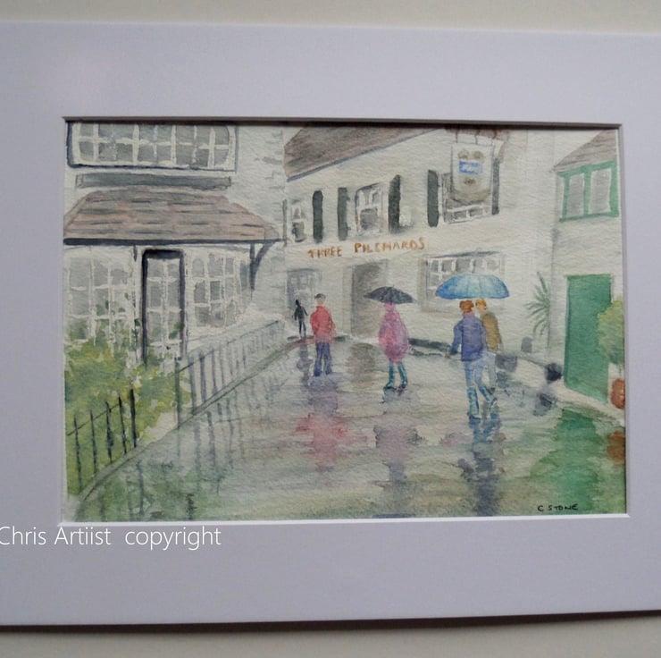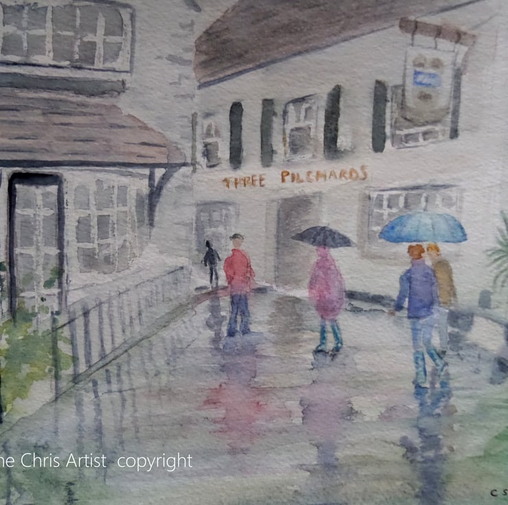 Original watercolour painting street scene, Rainy Day in Polperro Cornwall
