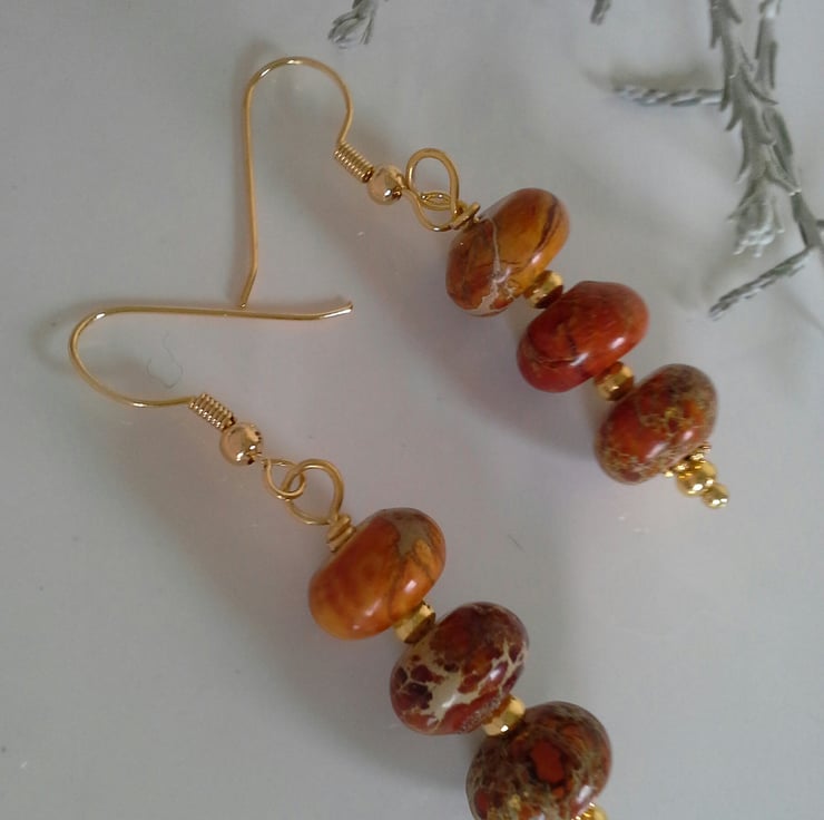 A sweet pair of earrings designed and hand crafted using picture jasper large roundels complimented with quality gold plate components.