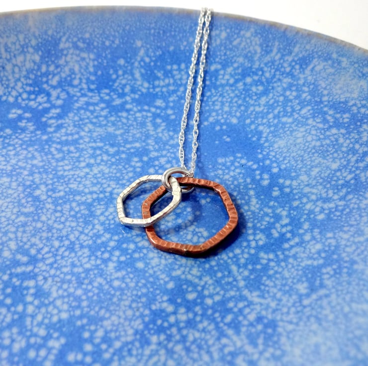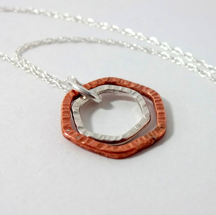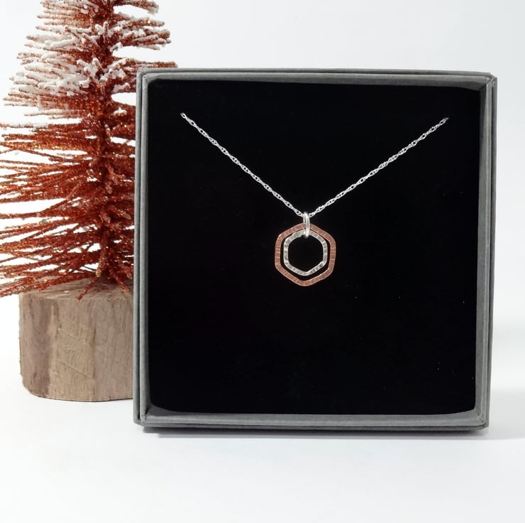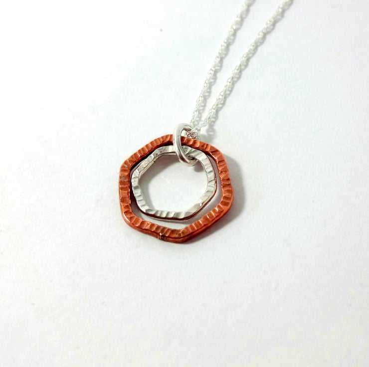 Gorgeous Modern Dainty Mixed Metal Necklace with a lightly textured Sterling Silver Hexagon nestling inside the larger textured copper hexagon.