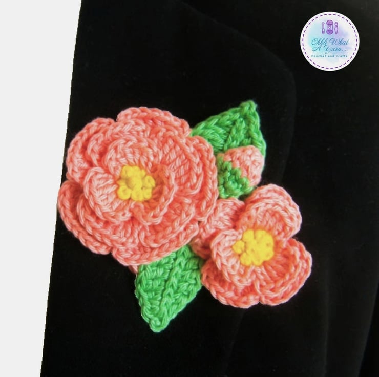 It has two crochet peonies and a peony bud with embroidered french knot centres and pretty green veined leaves. It has a standard brooch back and is hand washable in cool water, dry flat and reshape while damp if necessary.