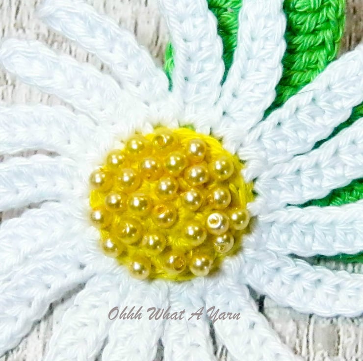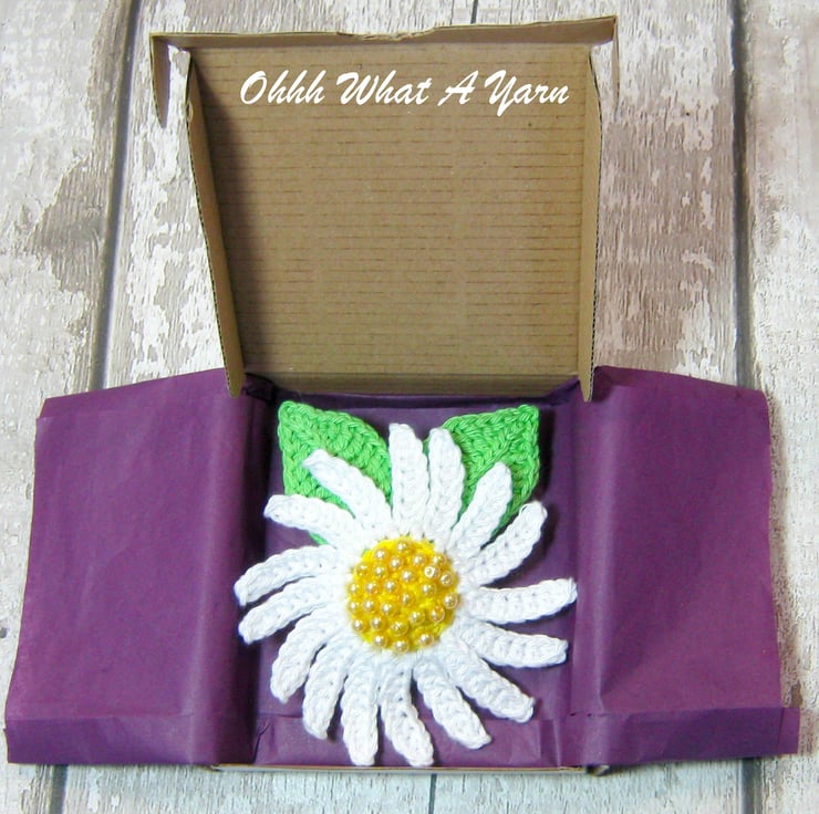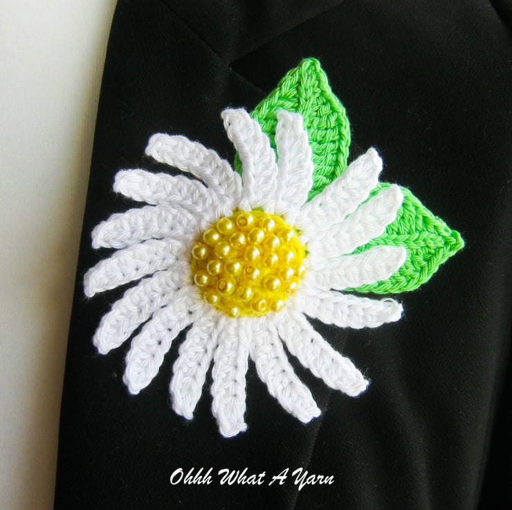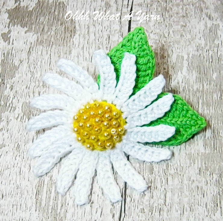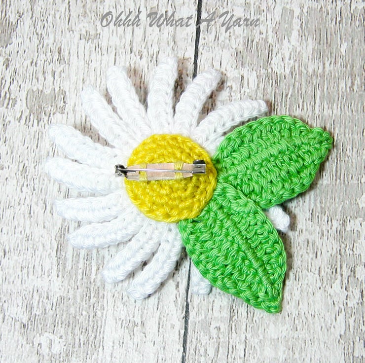 It has one crochet daisy with a beaded centre and pretty green veined leaves. It has a standard brooch back and is hand washable in cool water, dry flat and reshape while damp if necessary.
