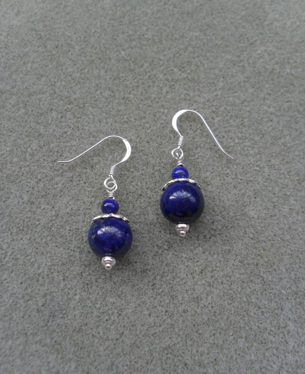 Lapis lazuli semi precious gemstones and sterling silver beads are attached to sterling silver ear wires