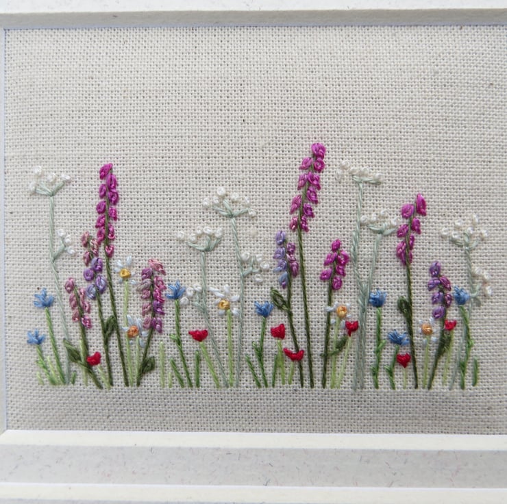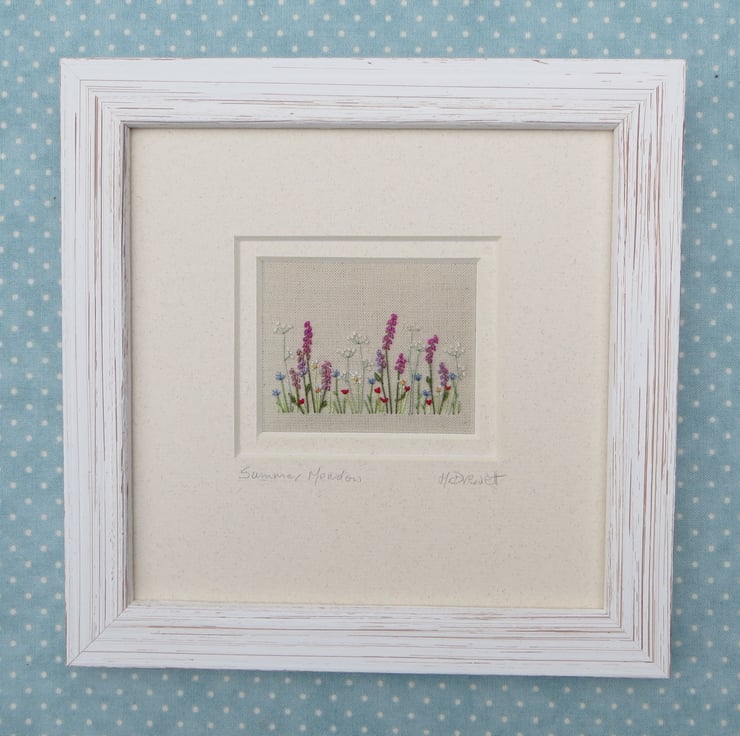 The embroidery is presented in a lightly distressed white wood frame measuring 7" (17.5cm) suqare. The embroidery will arrive with glass in place, corded, all ready to hang up on your wall. The mount is signed and carries the title 'Summer Meadow'. My studio stamp is on the back.