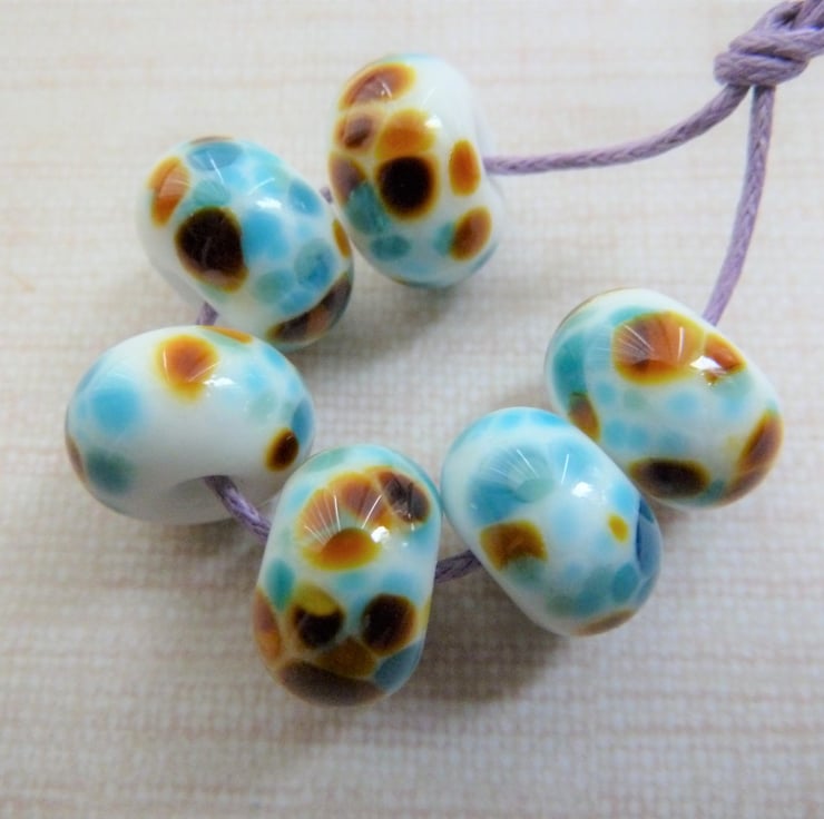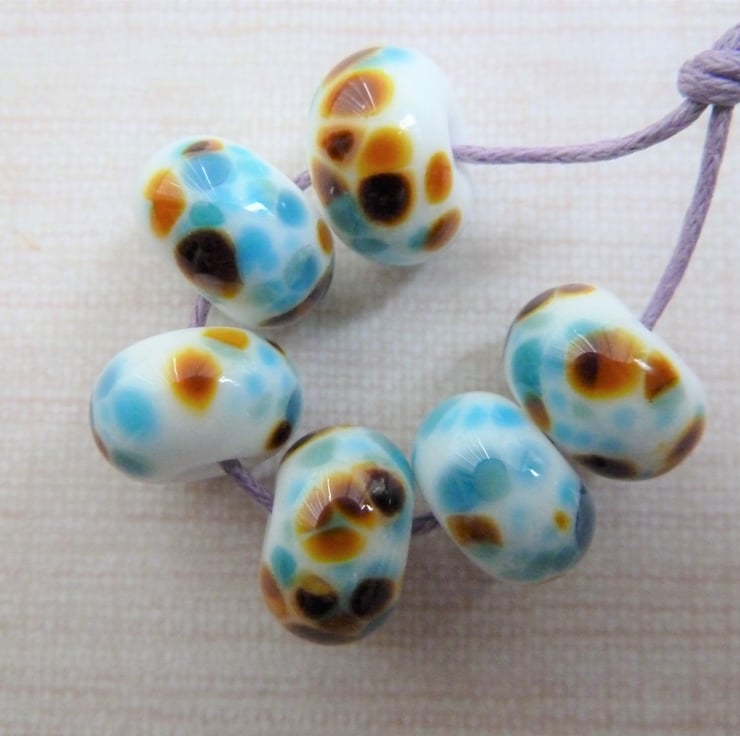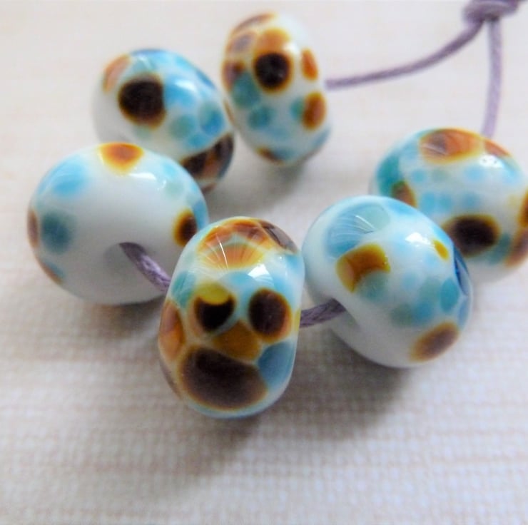 A set of 6 lampwork glass beads made with white glass and rolled in blue/brown frit.