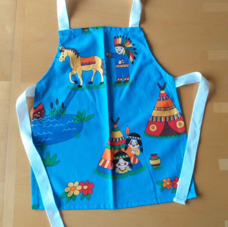 This is a lovely bright kingfisher cotton apron.It depicts cheerful little Indians and various cartoon features of their lives. I have made it of a good quality machine washable cotton, with acrylic webbing straps. It measures approximately 17" (43 cm.) from neck to hem, and 14" (36 cm.) at the widest point, and will fit a child from about 2-6 years. The child, wearing a different apron in the photo, is three years old. There is a matching apron for an older child or small adult also in my shop.