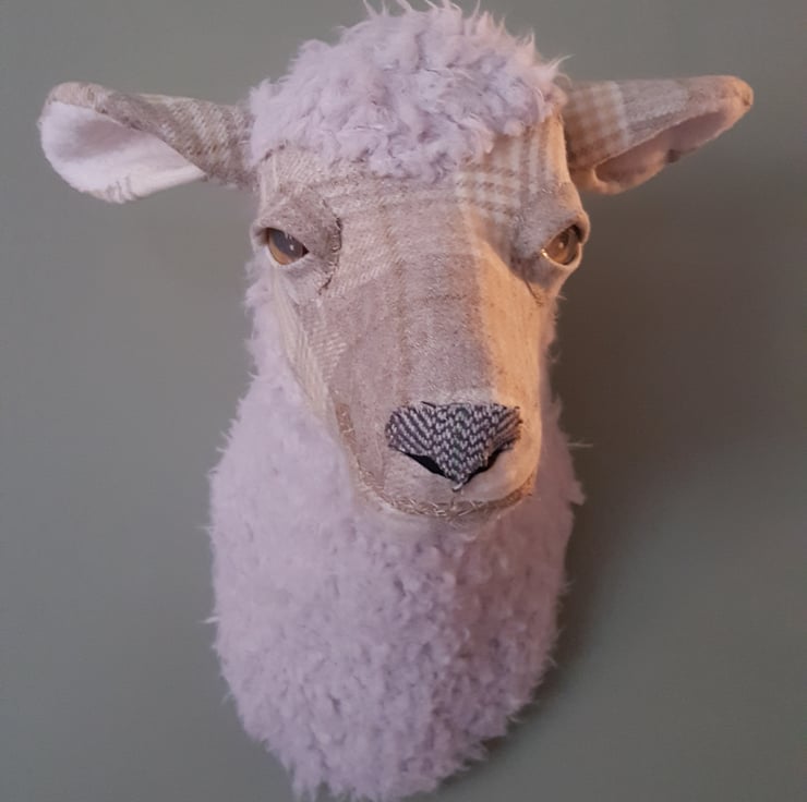 A lifesize faux sheep head which I have cast myself and covered in tweed and tartan fabric. The fleece is faux sheepskin.