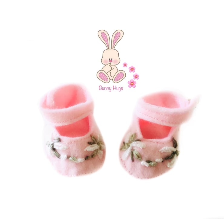 A pretty little pair of pink shoes to fit the Mulberry Green characters. The shoes are made from pa;e pink felt and are embroidered with white flowers.