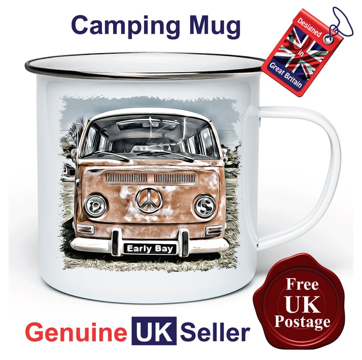 Unofficial Early Bay Window Campervan Mug, Camping Mug, Hiking Mug, Fishing Mug, Outdoor Mug 11oz Enamel Printed Both Sides this enamel mug is a great gift to give for birthdays, Christmas,and many more special occasions This is a classic Enamel With Stainless Steel Rim mug perfect for round the campfire or at a retro show with Artwork Designed by Aggies Bags.
