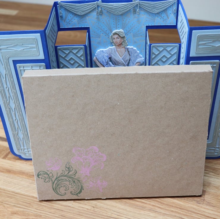 This card is 18 cm by 14 cm when closed Approximate, and comes with a Kraft card envelope with a beautiful stamped flower in green and pink in the lower corner on the back.