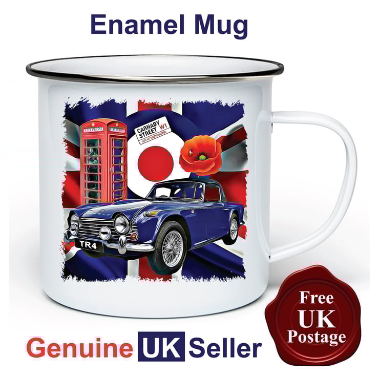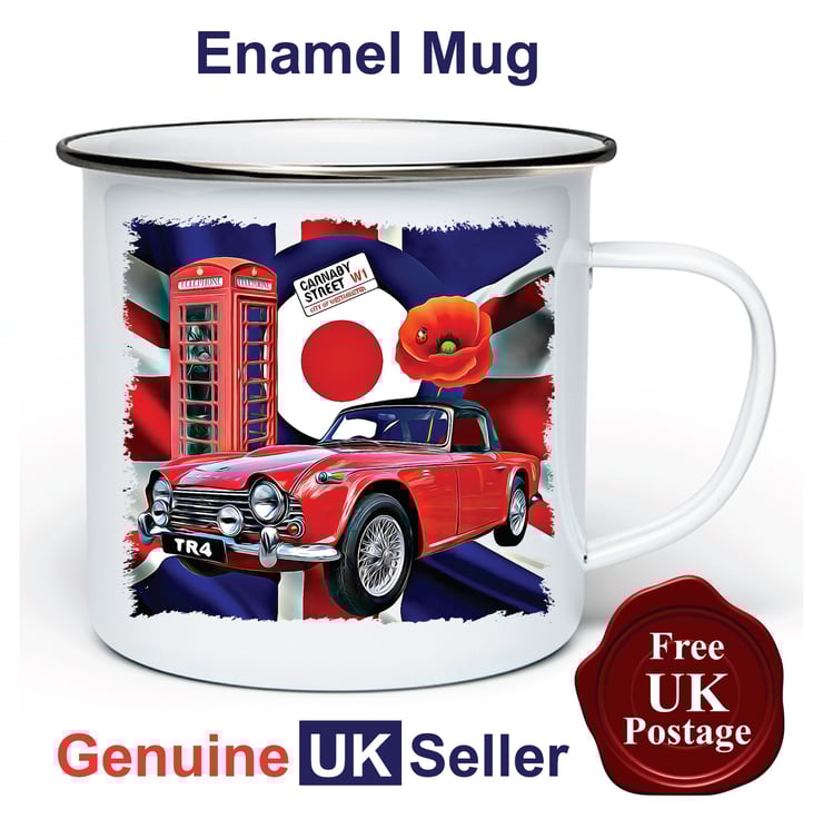 Unofficial Triumph TR4 Mug, Camping Mug, Hiking Mug, Fishing Mug, Outdoor Mug 11oz Enamel Printed Both Sides this enamel mug is a great gift to give for birthdays, Christmas,and many more special occasions This is a classic Enamel With Stainless Steel Rim mug perfect for round the campfire or at a retro show with Artwork Designed by Aggies Bags.