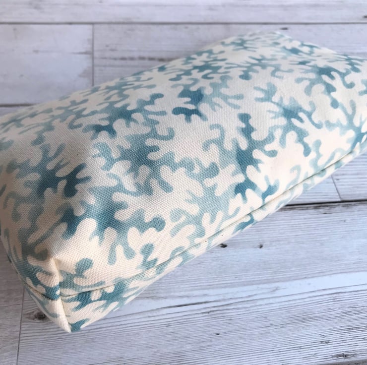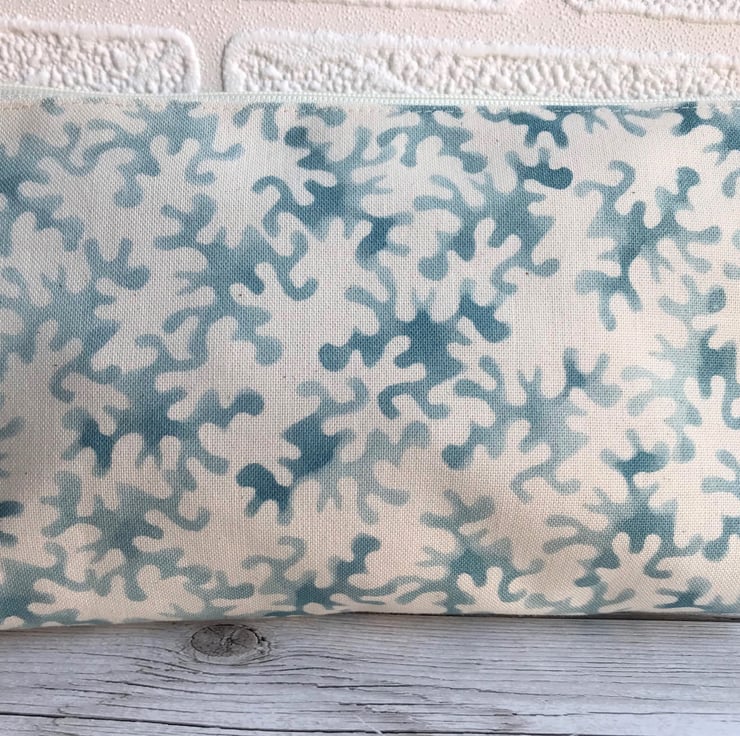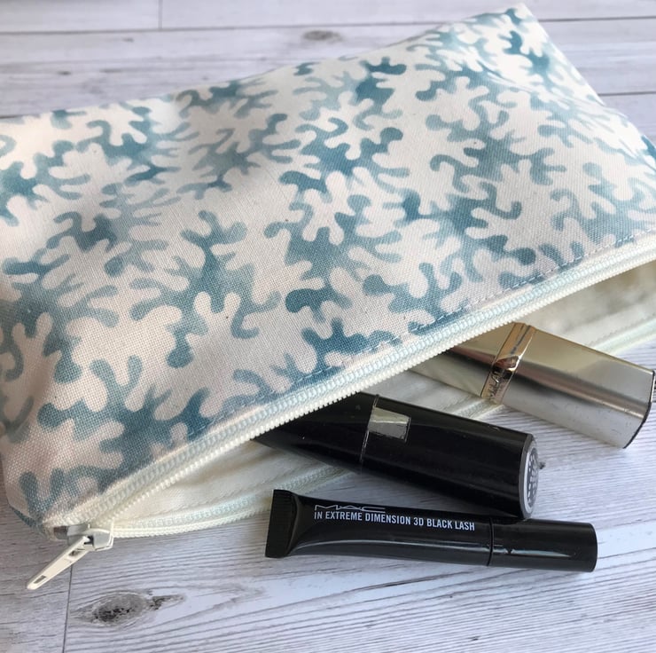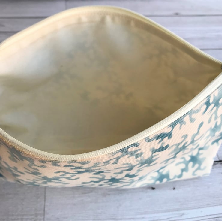 A handy make up bag with an attractive blue and cream abstract print pattern. The cosmetic bag fastens with a cream zip and is lined with cream fabric. The base of the bag is boxed giving lots of space inside.