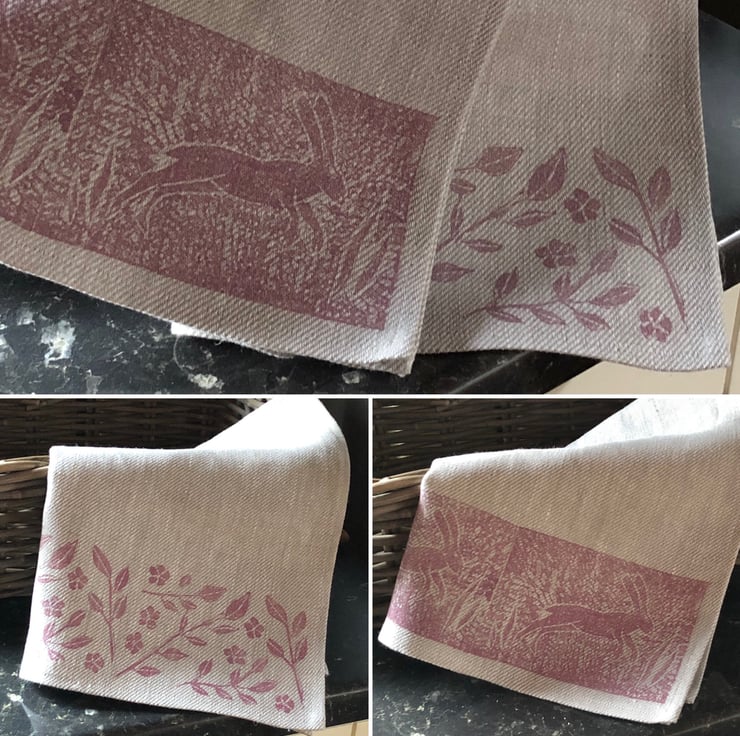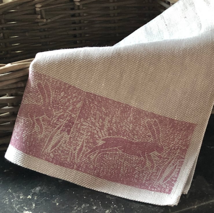 This country kitchen style tea towel has been made from a quality linen fabric and then hand printed using a Lino block carved by myself depicting a beautiful leaping hare.