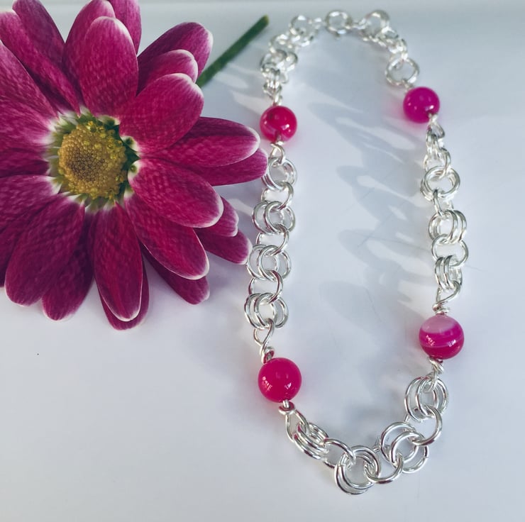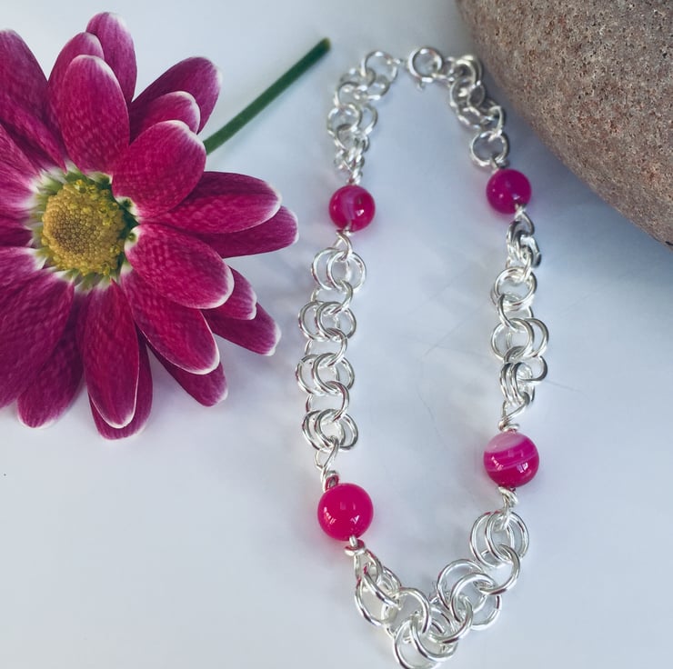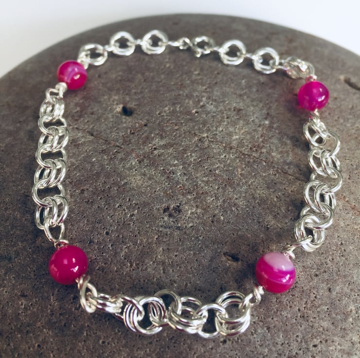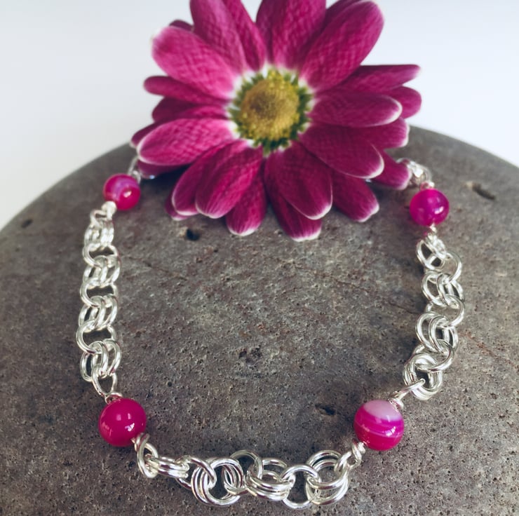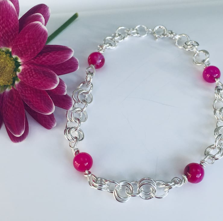 This bracelet is made from sterling silver chain links with pretty fuchsia pink agate gemstone beads. It is finished with a sterling silver bolt ring.