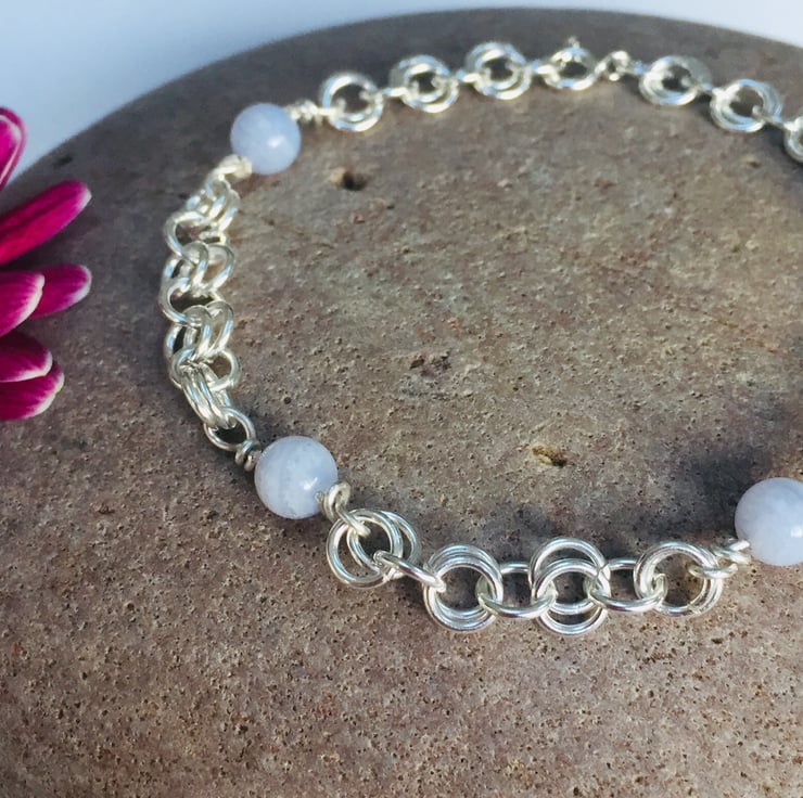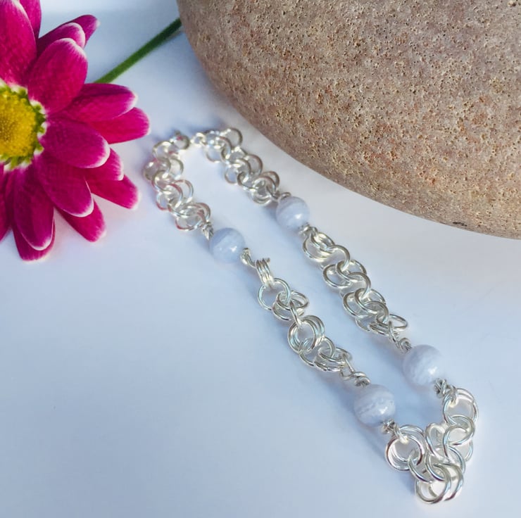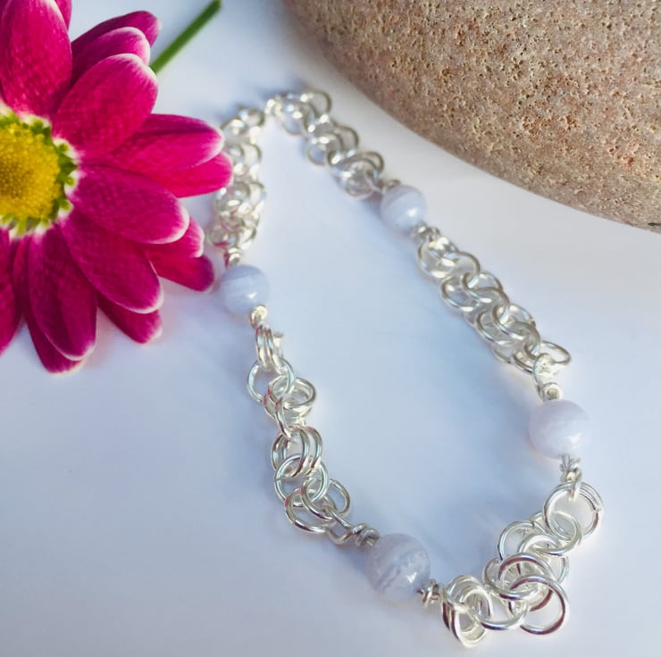 This bracelet is made from sterling silver chain links with delicate blue lace agate gemstone beads. It is finished with a sterling silver bolt ring.