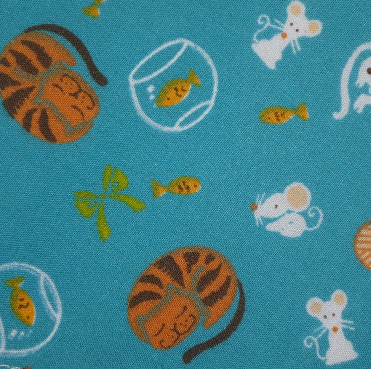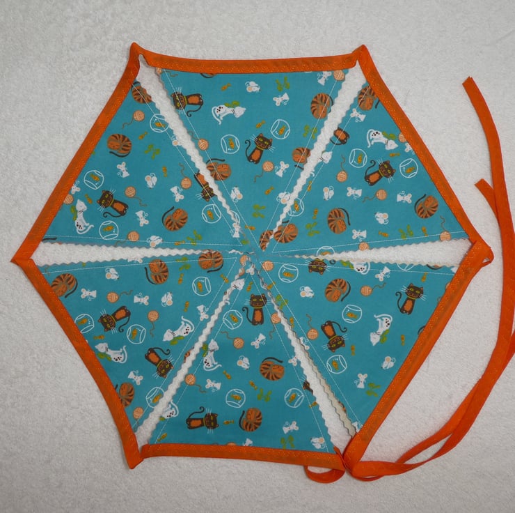 This bunting is made from a lovely cats goldfish and mice print poly/cotton fabric. This fantastic bunting would make a great addition to your home. It could be used for a childs room, summer barbecues, camping trips or indoors.