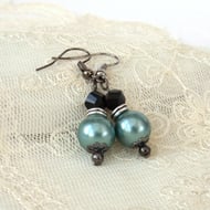 An unusual pair of earrings, with green agates, smaller green onyx and copper beads and wires.